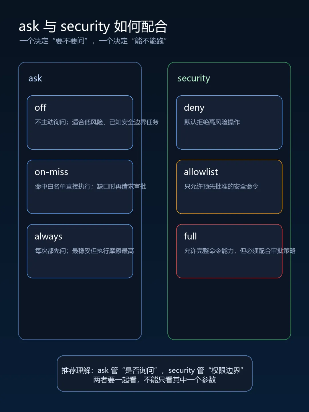 核心判断:ask决定“要不要问你”, security决定“能不能执行”。