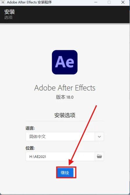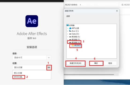 3.点击文件夹图标点击更改位置选择要装的盘符位置点击新建文件夹,并重命名AE2021,点击确定
