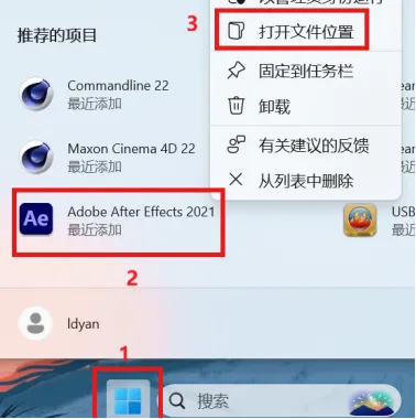 7.点击桌面下方开始菜单,选中Adobe After Effects 2021,点击鼠标右键,选择打开文件位置。