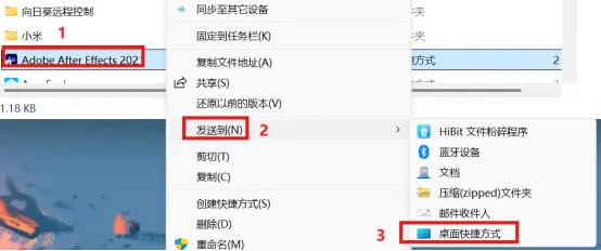 8.选中Adobe After Effects 2021,点击鼠标右键,选择发送到,点击桌面快捷方式。