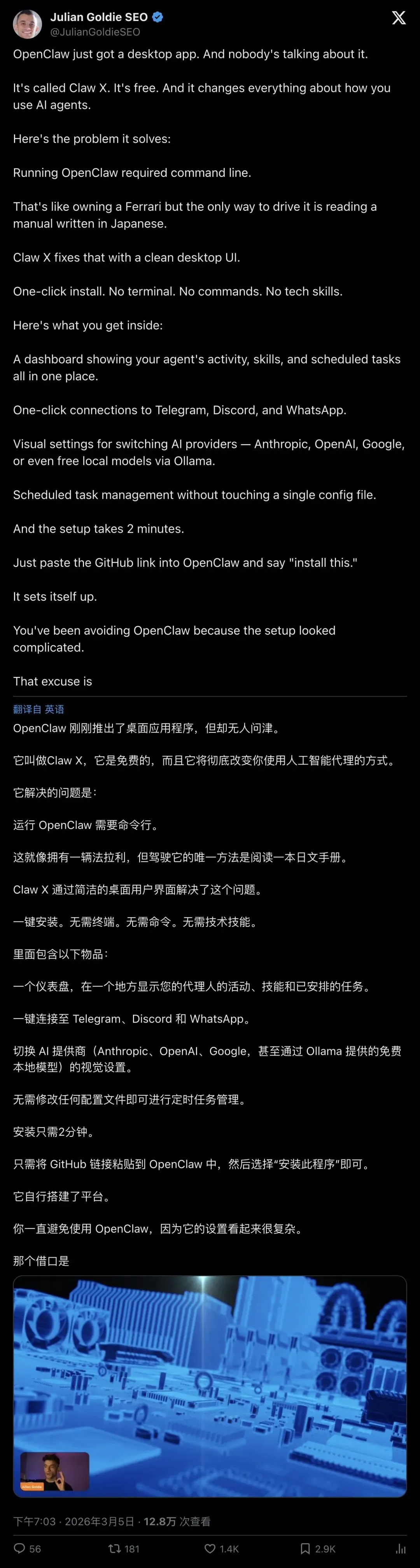 ▲ 传播热帖强调:桌面 UI、one-click install、no terminal/no commands