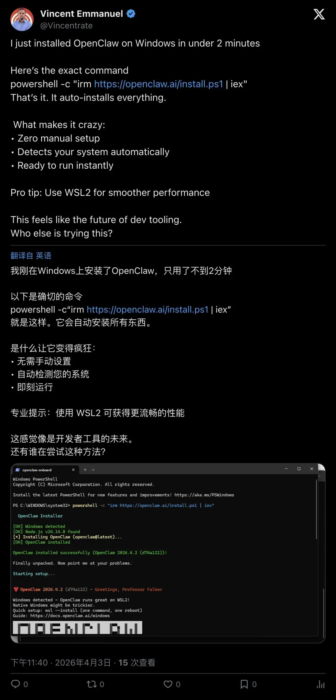 ▲ 有人晒出 PowerShell 安装:`irm https://openclaw.ai/install.ps1 | iex`,强调“under 2 minutes”