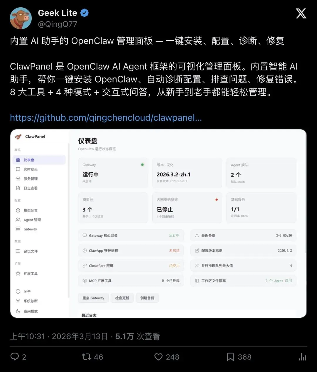 ▲ ClawPanel 的传播点很“产品”:一键装、自动排查、修复错误
