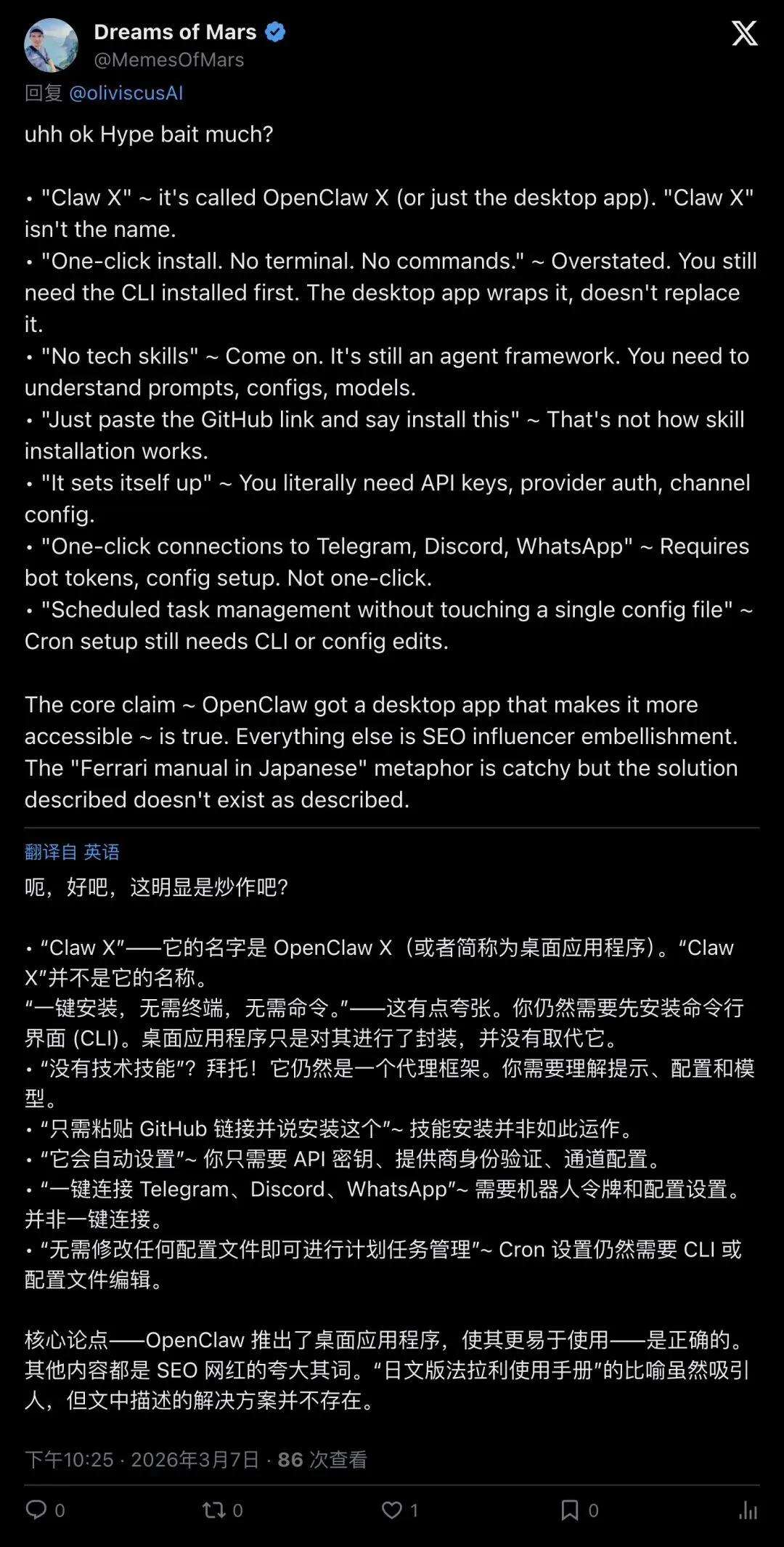 ▲ 质疑点很现实:桌面 App 能提升可用性,但“完全零配置”并不总成立