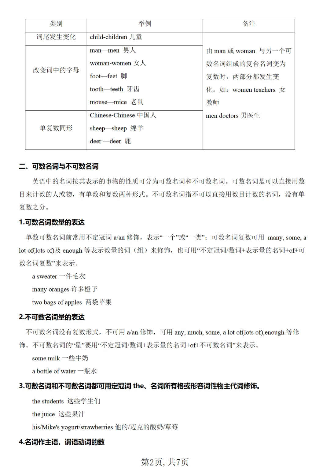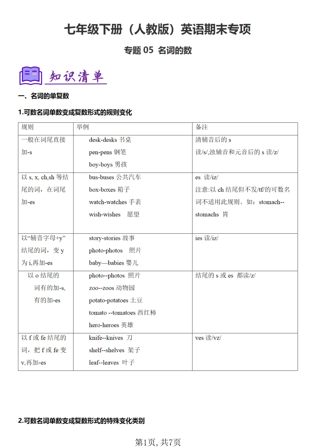 【免费下载】七年级(下)英语 考点清单05 名词的数 【精讲精练】《人教版》,PDF电子版,共7页,先保存,以免资源失效