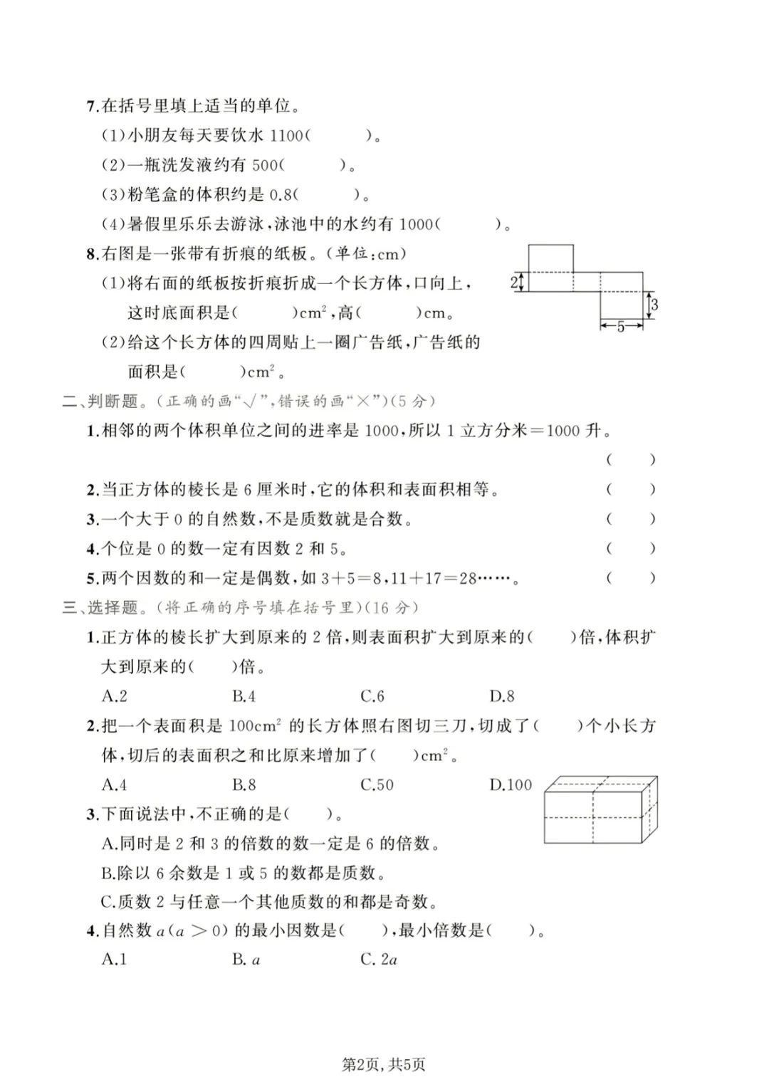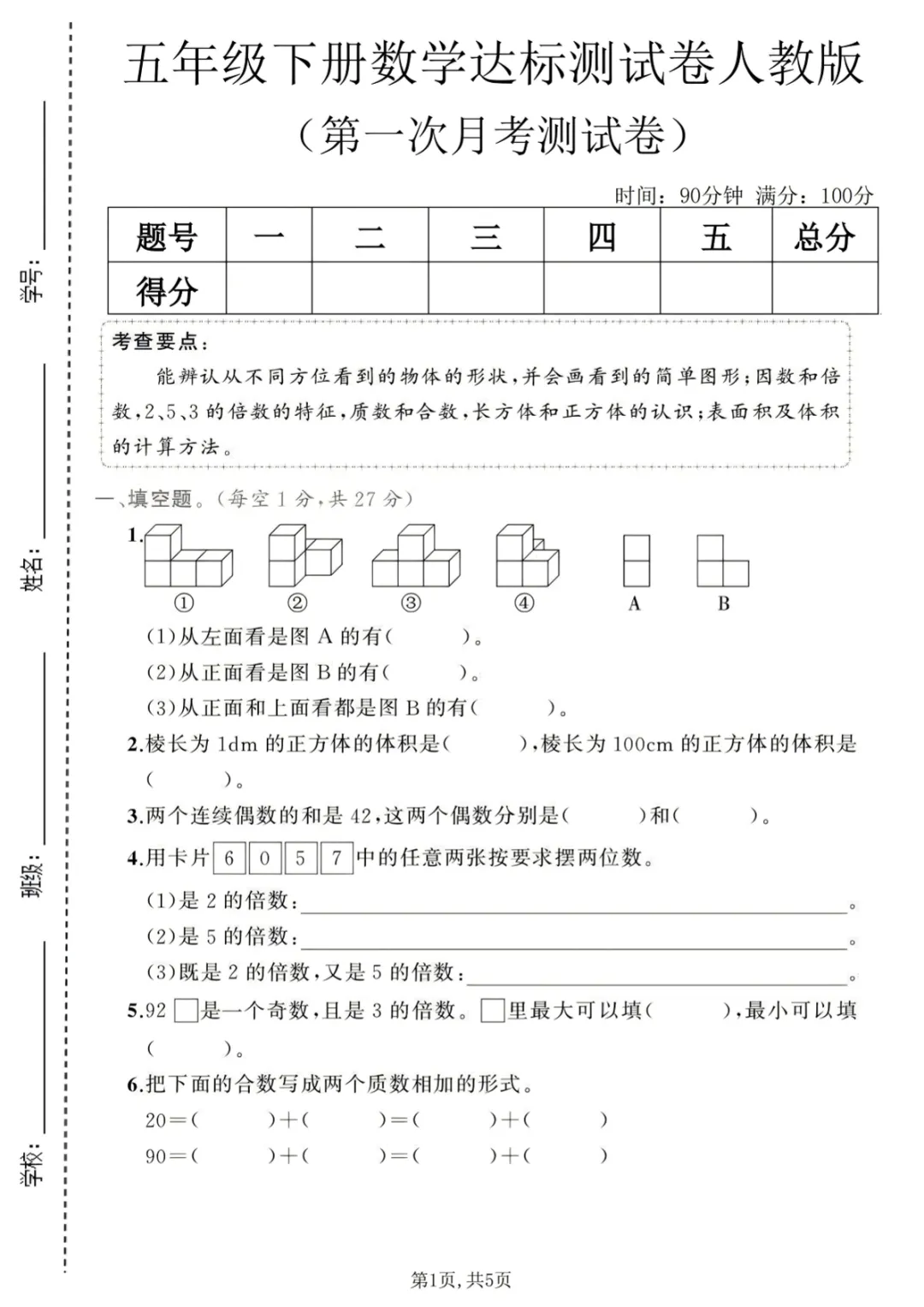 【免费下载】五年级(下)数学 第一次月考达标测试卷《人教版》,PDF电子版,共5页,先保存,以免资源失效