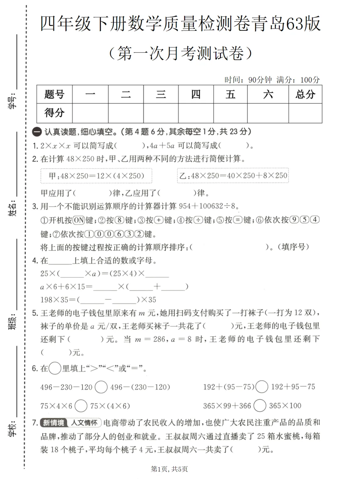 四年级(下)数学 第一次月考质量检测卷《青岛63版》