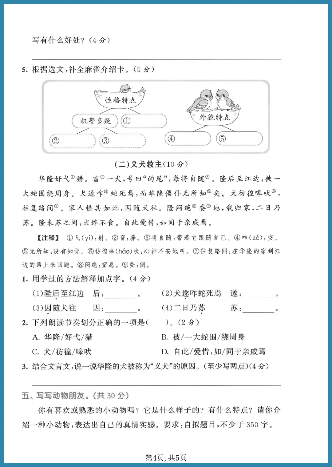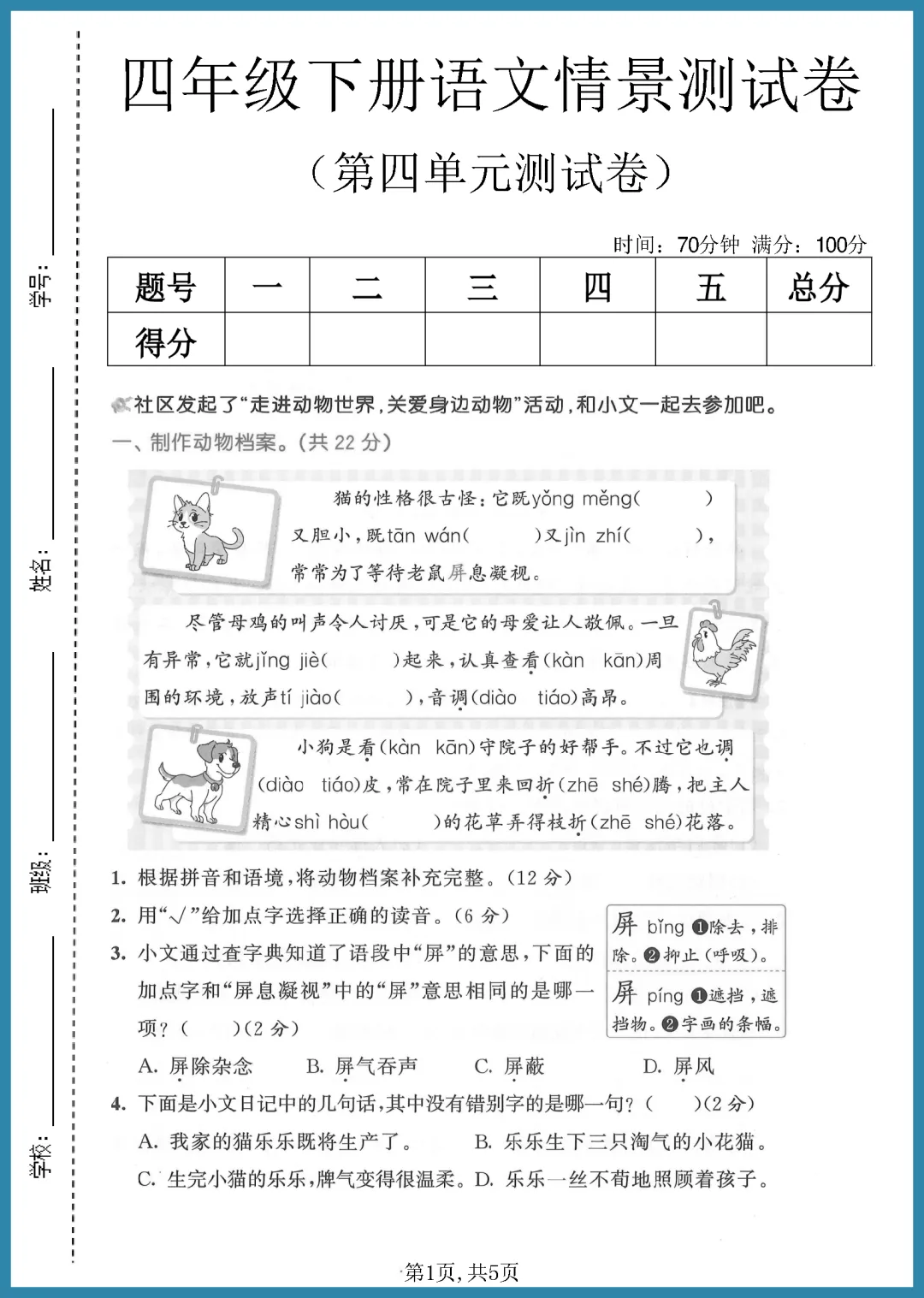 各位家长看过来!这份 2024 年最新版四年级下册语文第四单元情景测试卷来啦,全套共 5 页,紧扣教材重点。试卷采用生动的情景化命题,涵盖字词积累、阅读理解与习作表达,能帮孩子轻松攻克单元难点,在趣味中巩固知识,精准查漏补缺。想要提升孩子语文成绩?别犹豫,赶紧下载打印,让孩子趁热打铁练一练,轻松拿下高分!