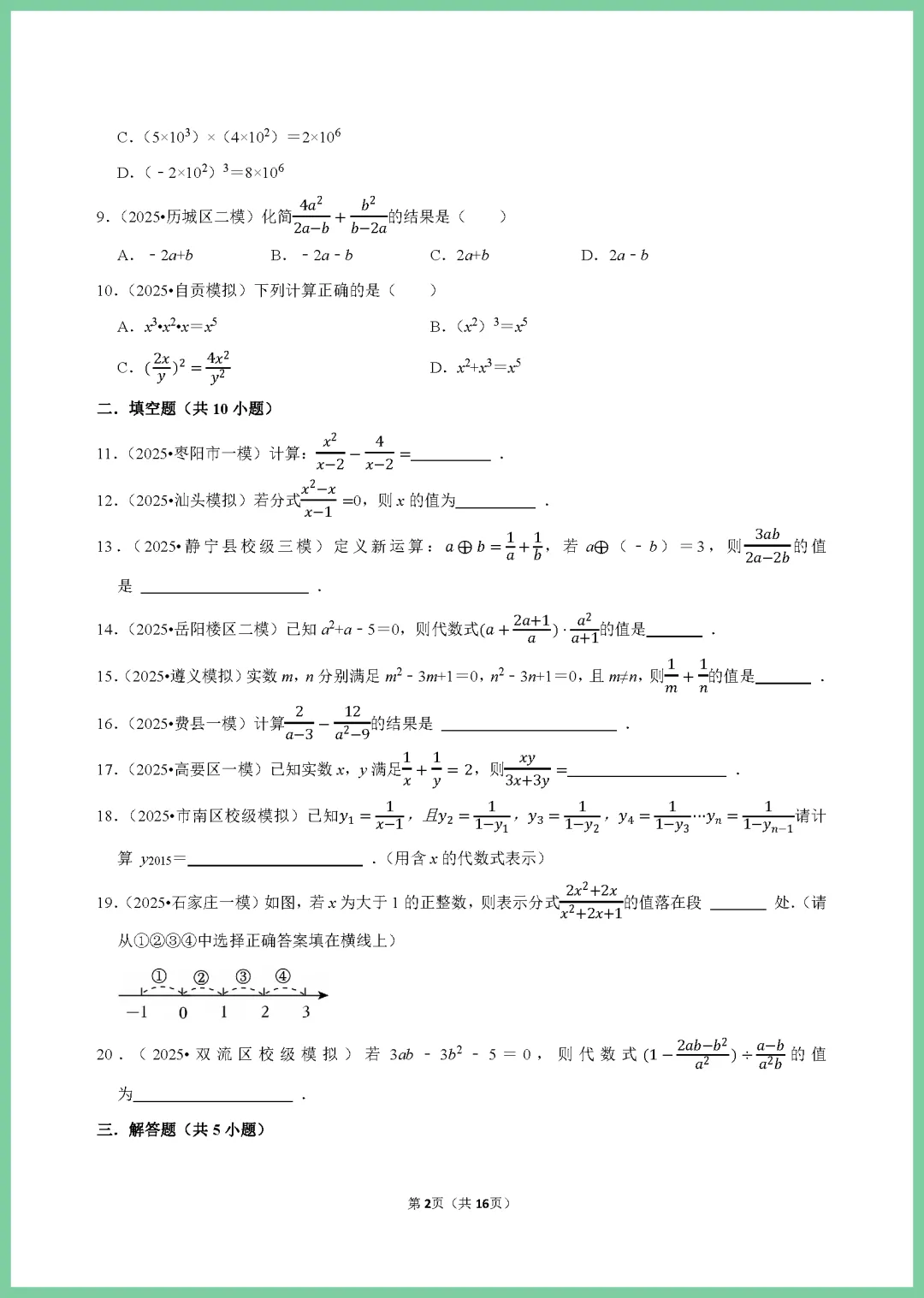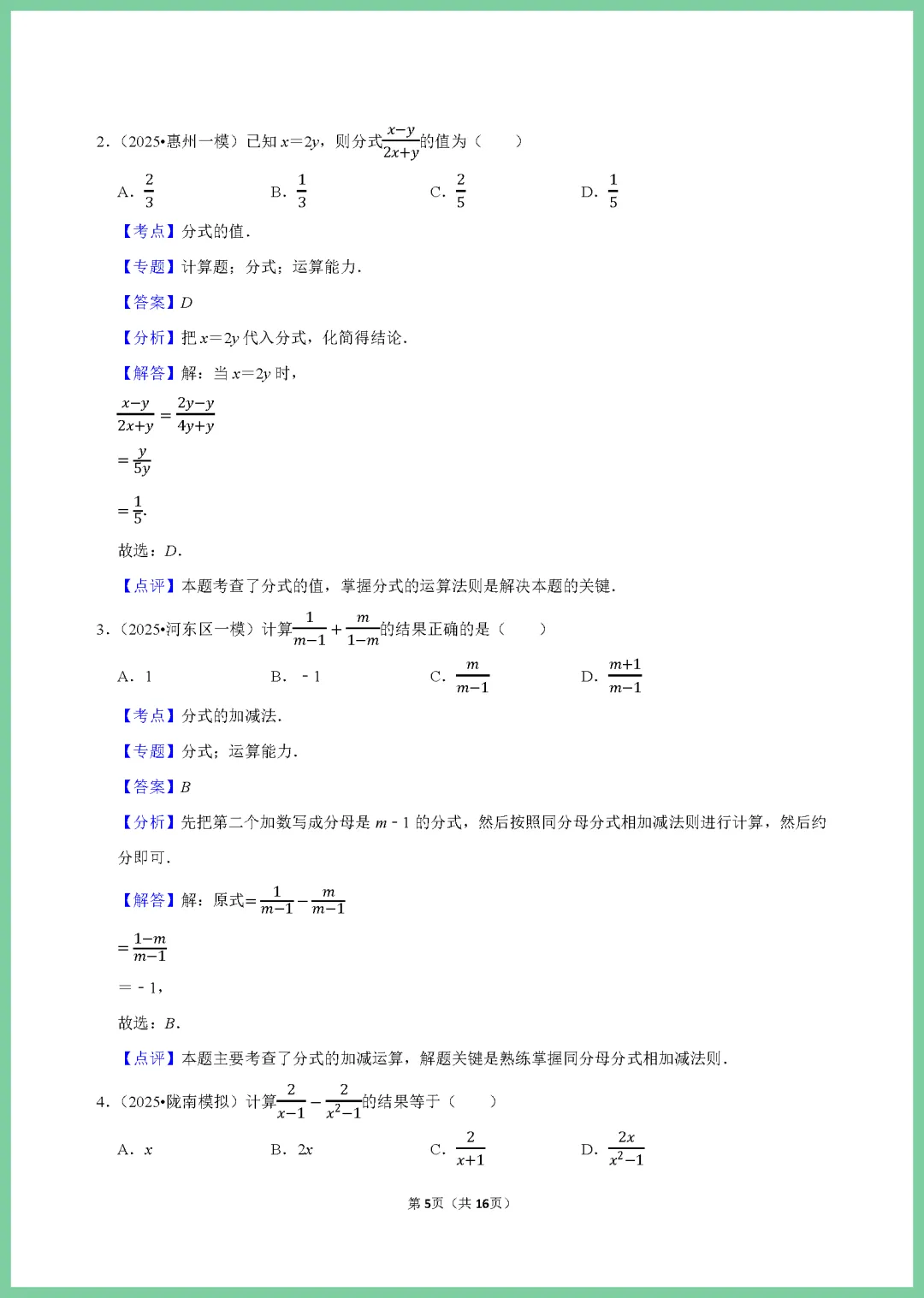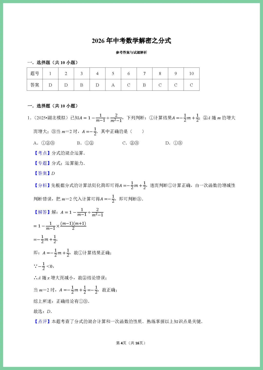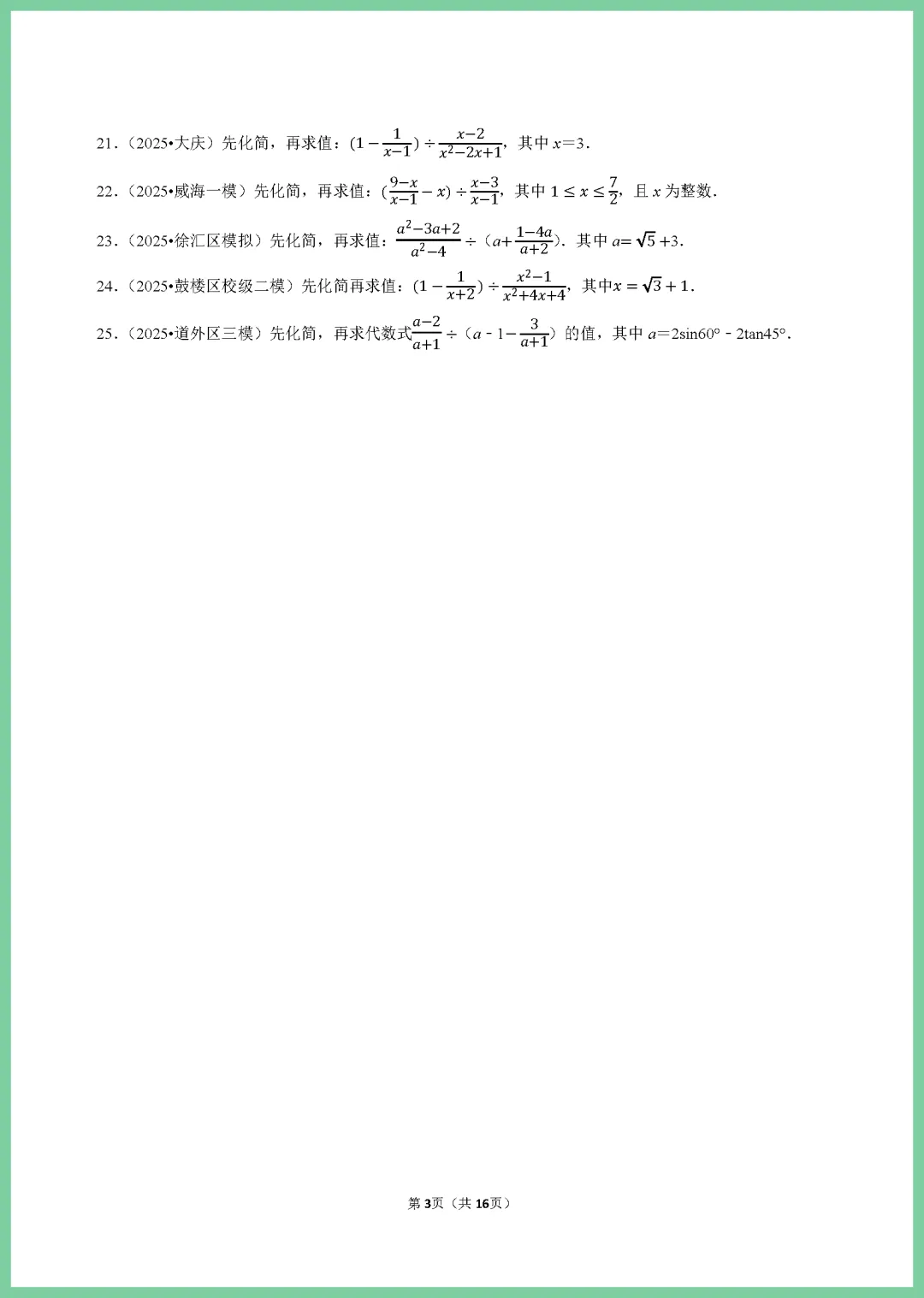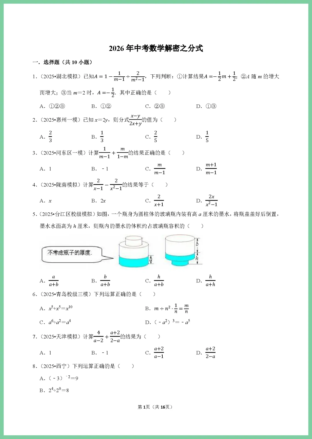 各位家长注意啦!这份 2024 版中考数学一轮复习《分式专项练习》来啦,专为初三学子打造,整整 16 页干货满满。资料紧扣考纲,涵盖分式化简、求值及方程应用等核心考点,题型由浅入深,精准击破孩子易错点。通过系统训练,能有效夯实基础,提升解题速度与准确率,让孩子在复习中少走弯路。机会难得,需要的家长赶紧下载打印,趁热打铁给孩子练一练,助力孩子冲刺高分!