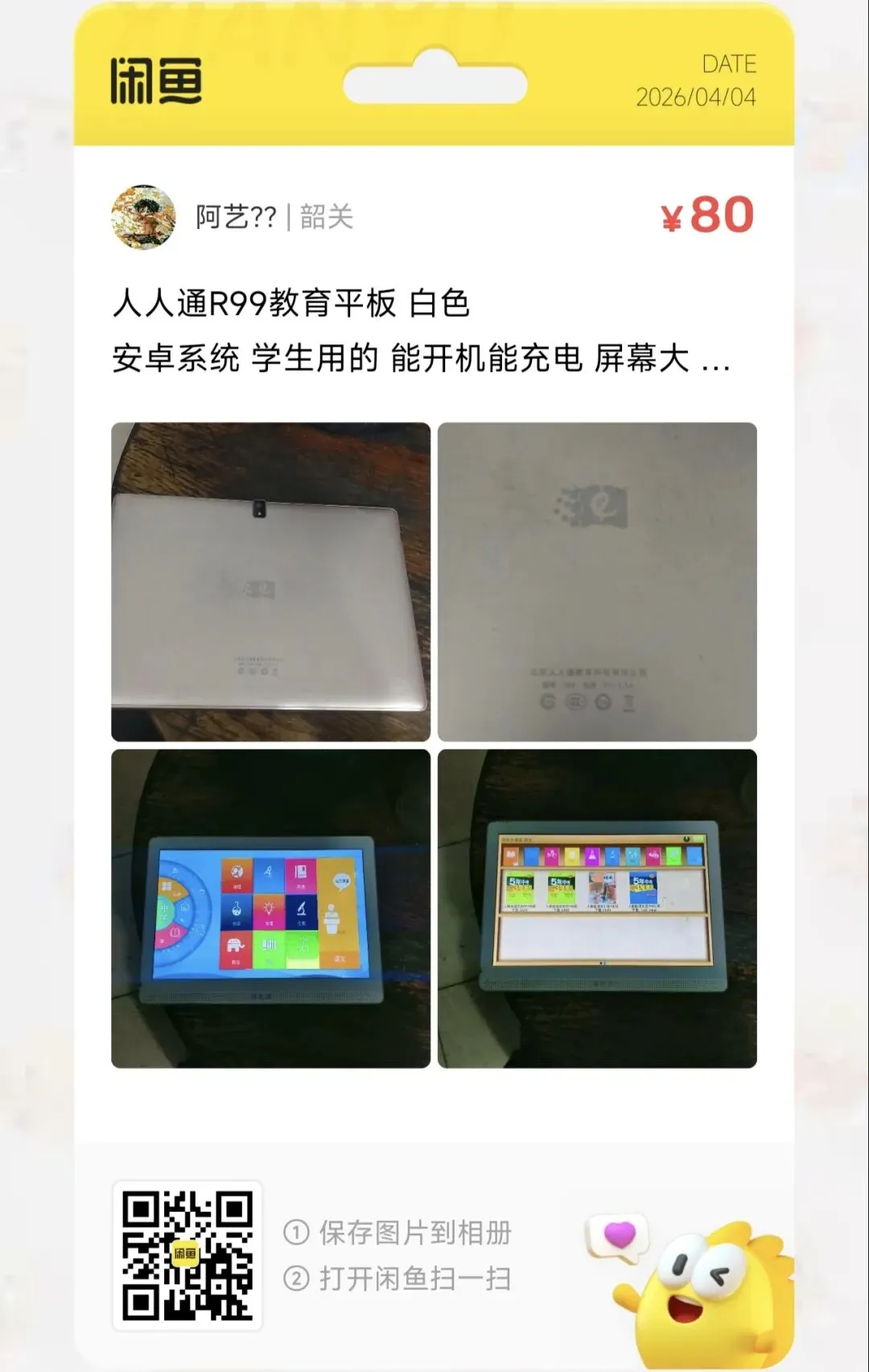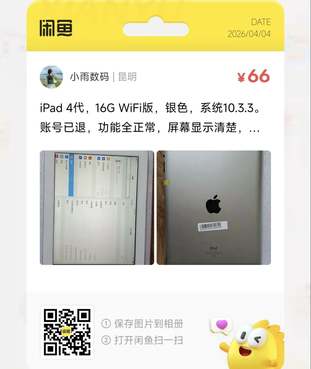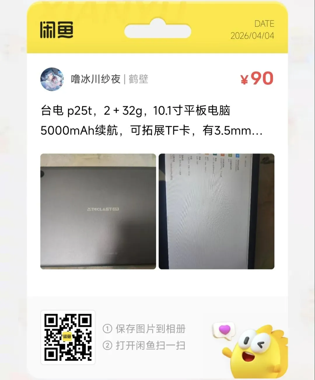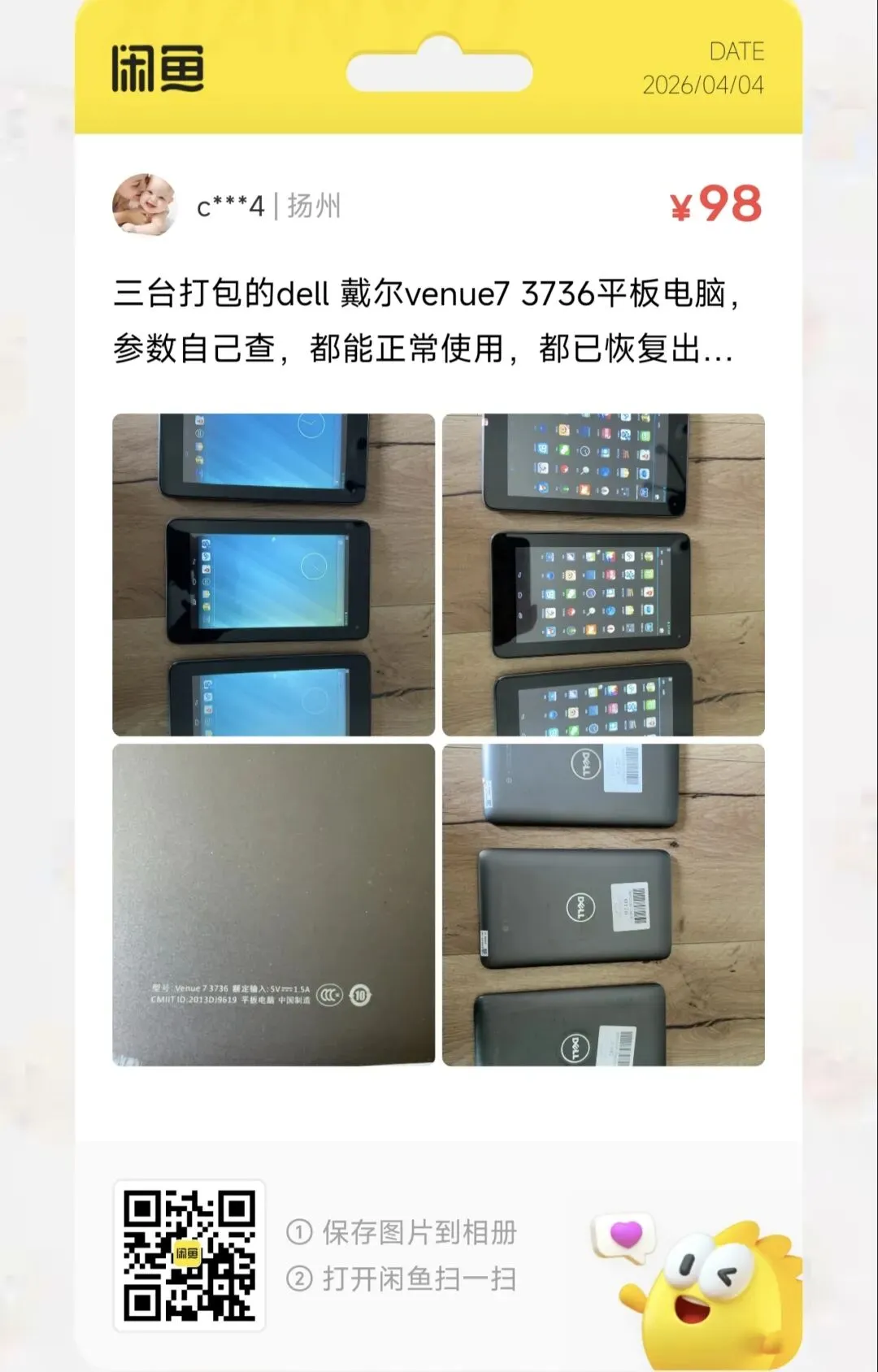 一台价格90元的台电 p25t,2+32g,10.1寸平板电脑98元打包带走三台dell 戴尔venue7 3736平板电脑一台价格66元的iPad 4代,16G WiFi版,银色,系统10.3.3。账号已退,功能全正常,一台价格180元的小米手机|8+256G|大陆国行一台价格68元的天猫精灵智能屏一体机,TG-Z02移动板一台价格150元的联想M7268W激光多功能一体机,型号M7268W,支持打印、复印、扫描,USB接口。一台价格30元的【苏泊尔辅食机】可蒸可搅碎,容量250ml,功能正常一台价格38元的极路客行车记录仪 可以连接手机app一台价格38元的执法记录仪,安卓系统,支持Wi-Fi,已刷安卓系统,运行流畅,摸鱼,mp4,小说一台价格35元的小米米家行车记录仪 MJXCJLY01BY,1080P高清,160°广角,支持WiFi,手机APP远程看录像一台价格39元的SWIFT-EYE LR-PSDVR-Ⅲ佩戴式音视频记录仪一台价格45元的Redmi Watch 3黑色款,型号M2215W1价格10元的幸运兔星空投影灯 充电款 带原装12套灯片价格100元的顺造洗地机H100Pro,吸拖洗一体,带高温洗地+电解水除菌,无线设计,支持米家APP一台价格88元包邮的Mate 新风机一体机新风 换气 125mm穿墙开孔式一台价格100元的美的滚筒护理机,几乎全新,外观很干净,功能正常联想L14 r5-4650u 空机不带内存硬盘。适合自己手里有二手内存,硬盘的同学,或者笔记本电脑坏了内存硬盘好的同学。29.9元薅一件秒杀款男女同款开春连帽卫衣,宽松百搭【包邮】 领卷370 元购买。淘口令:5$MKN35WPMWoi$:// CZ613516.97薅一瓶90片哈药六盖中盖,【柠檬酸钙+锌+维生素B1B2B6+维生素C+叶酸】【包邮】。领卷20元购买。淘口令:4$iOA25dwnqIT$:// CA1371