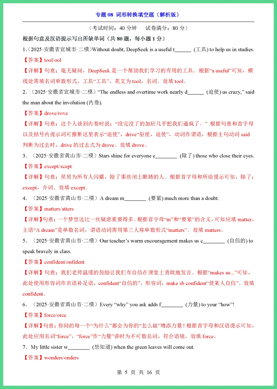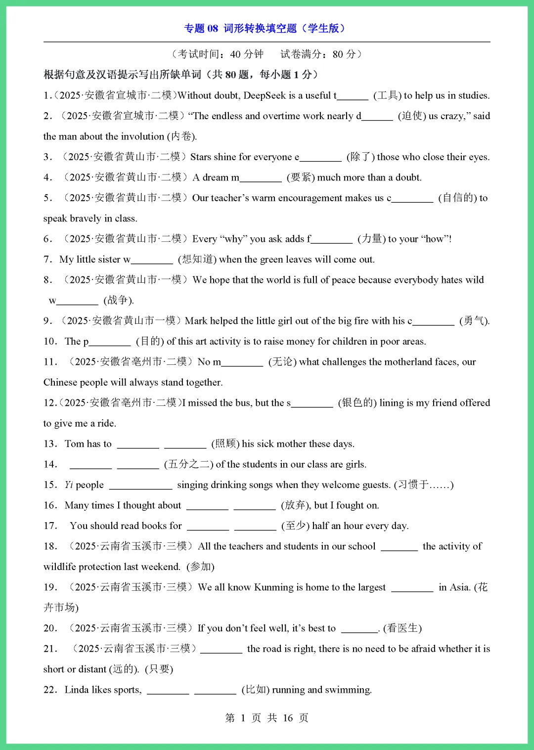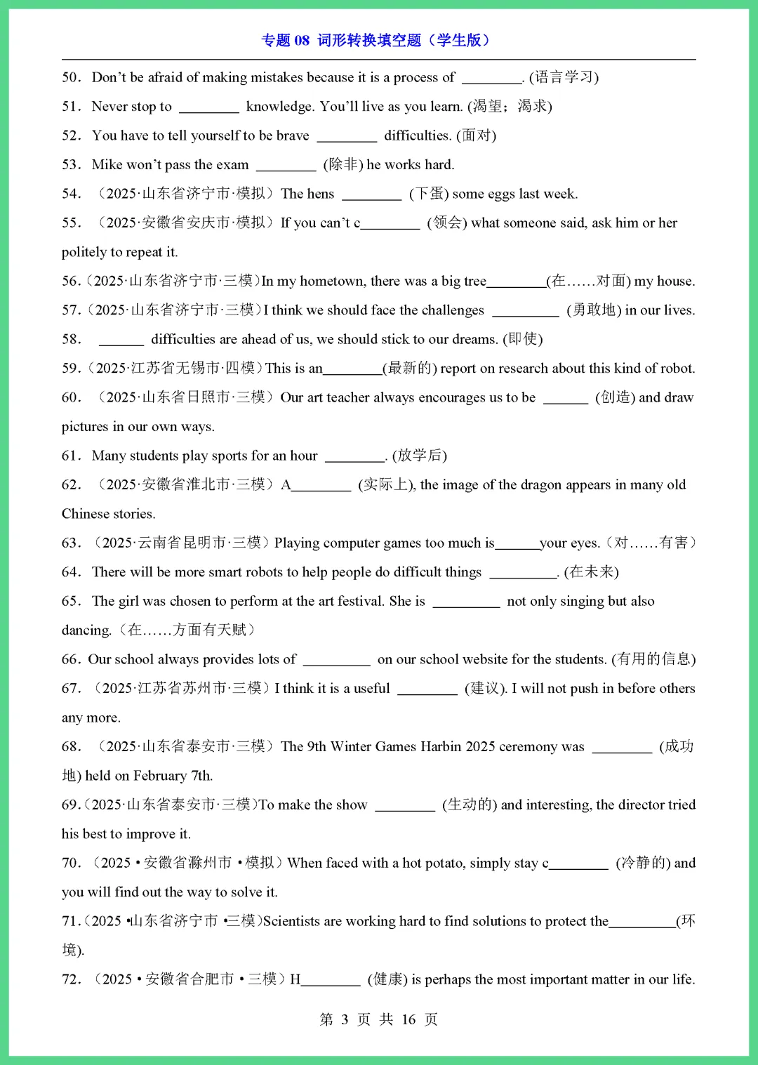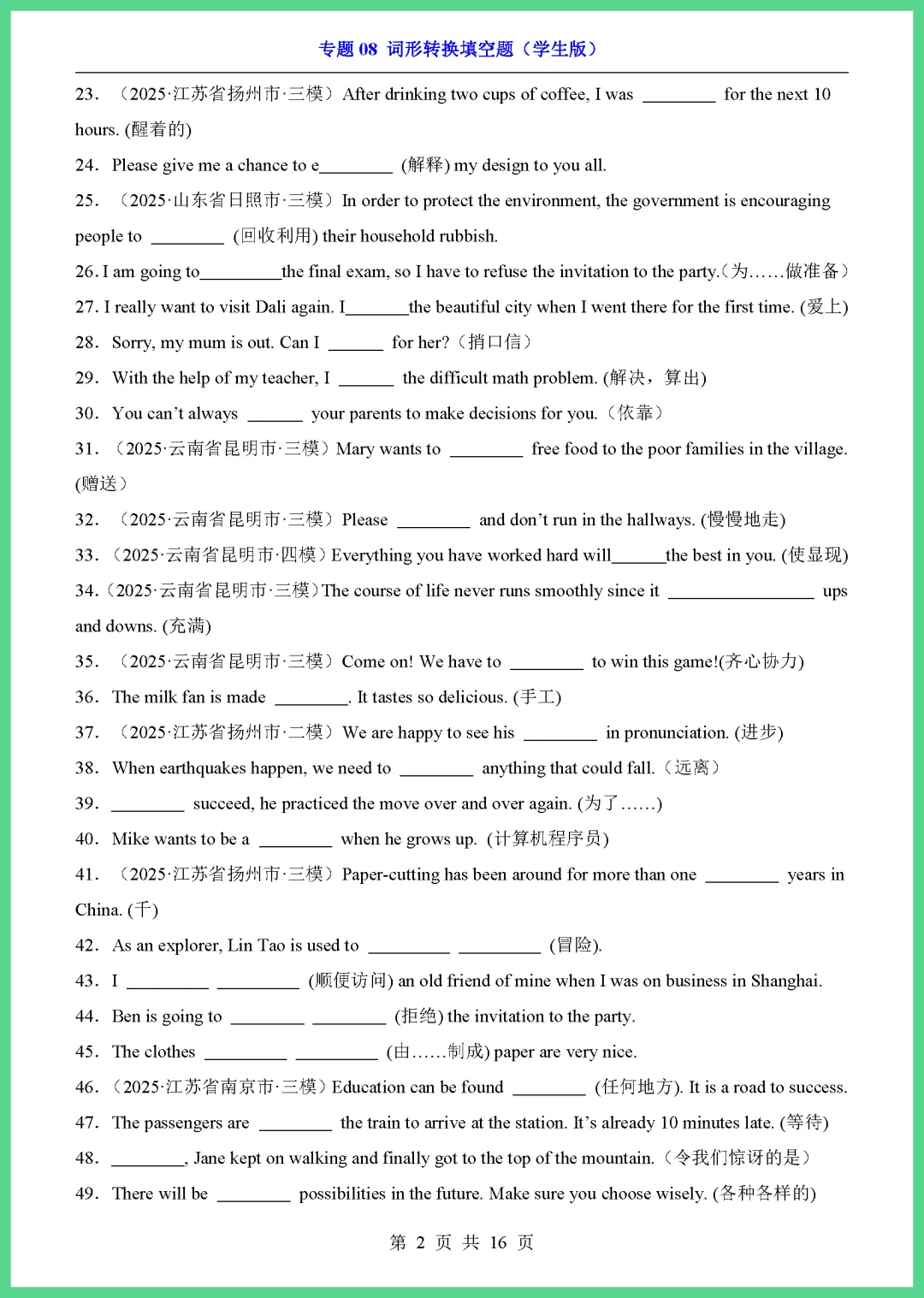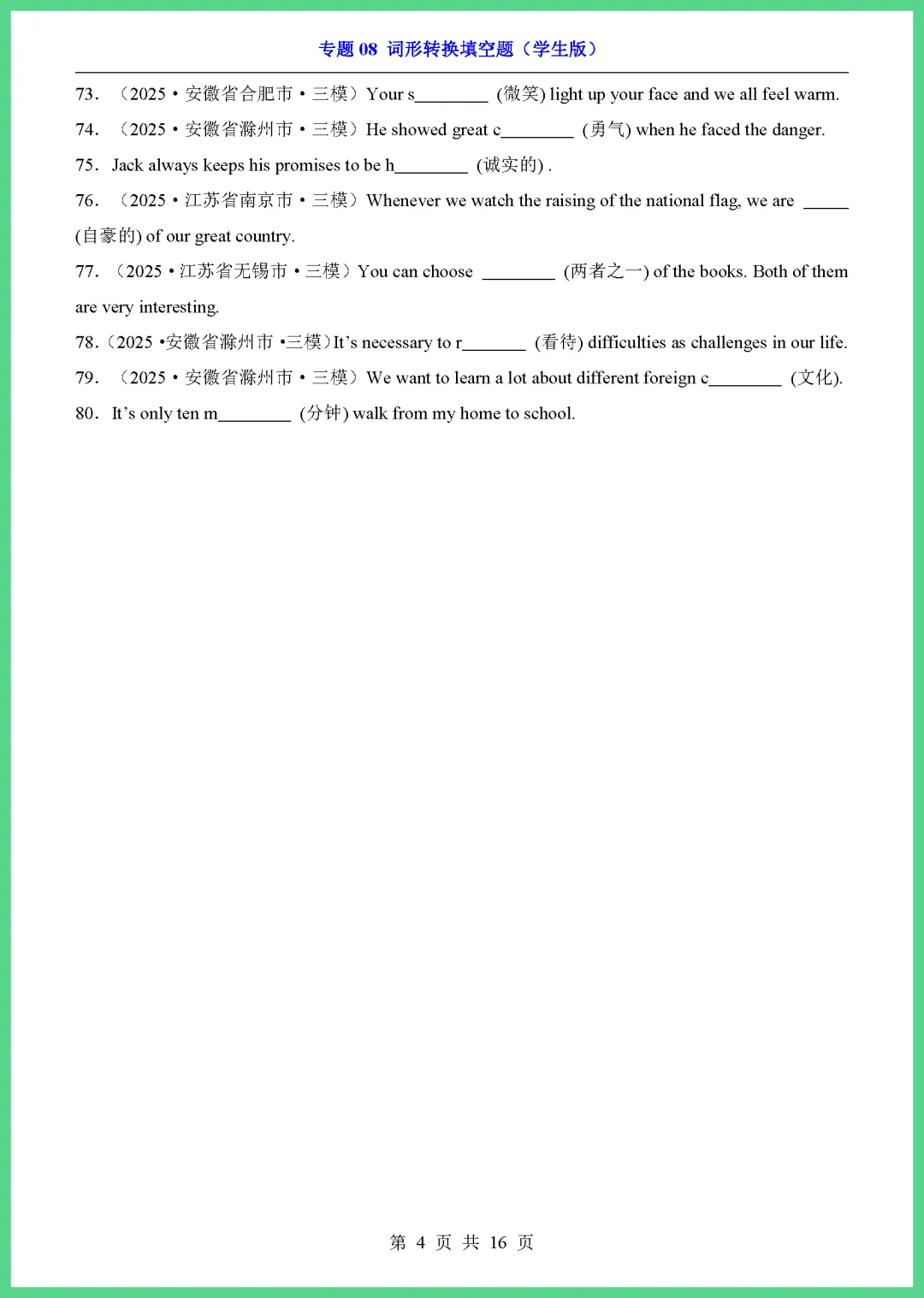 各位家长注意啦!2026 中考英语专项突破来了,这份《专题 08 词形转换填空题》共 16 页,专为初三学子量身打造。资料精选高频考点,涵盖名词、动词、形容词等各类变形规则,通过典型例题帮助孩子理清解题思路,轻松攻克易错点,大幅提升答题准确率。每天练几道,基础更牢固!机会难得,需要的家长赶紧下载打印,让孩子趁热打铁练起来吧!