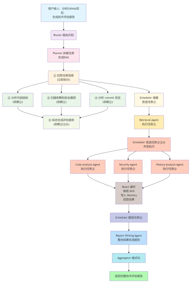 如果 Agent 正忙,消息在队列里等着,不会丢失。如果队列满了(背压),消息转入 Dead Letter Queue,等待后续处理。整个流程里没有一个强制等待点,这是 OpenClaw 能实现真并发的底层原因。多 Agent 系统里最容易被忽略、但实际上非常重要的一层,是内存管理。一个 Agent 在执行任务时需要"记住"东西。但记什么、记多久、怎么用,这些问题如果没设计好,要么 token 爆炸,要么上下文丢失,要么不同 Agent 之间互相污染。OpenClaw 把 Agent 的记忆分成三层:Working Memory(工作内存),存的是当前任务的上下文——正在处理什么、已经调用了哪些工具、工具返回了什么。它是短暂的,任务结束就清空。好处是每次任务开始都是干净的,不会被历史信息拖累。Episodic Memory(情节记忆),存的是当前会话内的历史轨迹。这个 Agent 在这次会话里做了什么、用户反馈怎么样,这些信息通过 Redis 持久化,可以在同一会话的多轮交互里被引用。Semantic Memory(语义记忆),也就是 soul.md 里的内容,是跨会话的长期知识库。存的是 Agent 的角色设定、过往经验总结、领域知识,通过 Vector DB 支持语义检索。新任务开始时,Agent 会先检索一遍相关的长期记忆,作为上下文的一部分注入。这三层的访问速度、容量、持久性各不相同,用来平衡"记得快"和"记得久"之间的矛盾。多个 Agent 有时候需要共享一些信息,比如"当前任务的总体进度"或者"用户偏好设置",这些放在 SharedContext 里。这里有一个坑值得专门提一下:多个 Agent 同时修改 SharedContext 的同一个 key,会发生写冲突。OpenClaw 用乐观锁来解决这个问题——每个 key 有一个 version tag,写入时检查版本号,如果发现"我读的时候是版本 3,现在要写的时候已经是版本 4 了",说明有别人改过,当前写操作失败,返回 ConflictError,调用方需要重新读取最新值,然后 merge 之后再写。这个机制能保证数据一致性,但也意味着:不要让多个 Agent 频繁并发地写同一个 SharedContext 字段,不然大家都在不停地读-冲突-重试,效率反而下降。设计 Agent 协作逻辑的时候,要尽量让每个 Agent 写自己独占的数据域,需要共享的内容尽量通过消息传递,而不是共享内存。光讲机制有点抽象,用一个具体案例把上面所有内容串起来。场景:用户输入"帮我分析这个 GitHub 项目,生成一份完整的技术评估报告"。消息进入 Router,识别为"技术分析 + 报告生成"的复合任务,路由到 Planner。① 拉取仓库信息 (可立刻执行)② 分析代码结构 (依赖①)③ 扫描依赖和安全漏洞 (依赖①) ← 和②并行④ 分析 commit 历史 (依赖①) ← 和②③并行⑤ 综合生成评估报告 (依赖②③④)