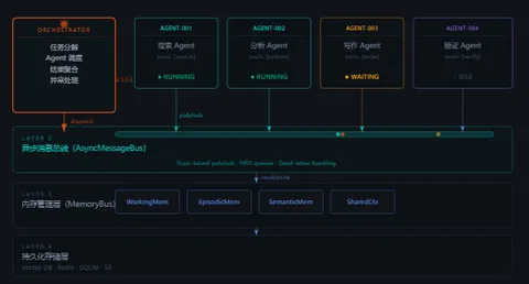 这段代码不复杂,但它实现了一个很重要的效果:在满足依赖约束的前提下,最大化并发度。该并行的时候绝不串行,该等待的时候绝不乱动。容错方面,Scheduler 内置了 WatchDog 协程。如果某个 Agent 超时未回复,任务会被转入 Dead Letter Queue(死信队列),触发重试或降级策略。单个 Agent 的失败不会让整个工作流崩掉。第四层:Agent 执行 — 每个 Agent 是一个持久运行的进程到了执行层,才是真正到了 Agent 干活的地方。这里有一个很多人会忽略的设计细节:在 OpenClaw 里,每个 Agent 不是一个函数,而是一个持久运行的 asyncio 事件循环。它不是"被调用一次,返回结果,结束",而是一直在跑,持续监听自己的消息队列(Mailbox),有任务来了就处理,处理完了等下一个。这个区别非常关键,它是真并发的基础——多个 Agent 可以同时在不同的事件循环里处理不同的任务,互不阻塞。classBaseAgent(AsyncRunnable):def__init__(self, agent_id: str, config: AgentConfig):self.id = agent_idself.mailbox = asyncio.Queue() # 私有消息队列self.working_mem = WorkingMemory() # 短期工作内存self.reasoner = Reasoner(config.llm) # LLM 推理引擎self.tool_runner = ToolRunner(config.tools)self.status = AgentStatus.IDLE async defrun(self):# 核心事件循环:持续监听邮箱whilenotself._shutdown: msg = await self.mailbox.get()self.status = AgentStatus.RUNNING result = await self._process(msg) await self.bus.publish(f"result/{self.id}", result)self.status = AgentStatus.IDLE