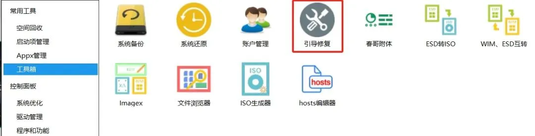 打开 DISM++,同样选择你的电脑系统,在“工具箱”里就能找到“引导修复”。或者点击菜单栏的“恢复功能”->“引导修复”。点一下,修复完成,重启电脑往往就能恢复正常。
