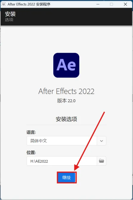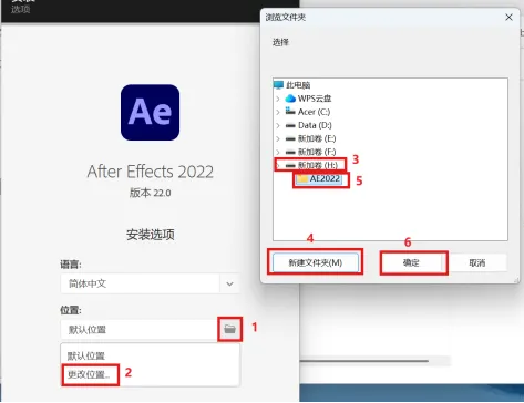 3.点击文件夹图标点击更改位置选择要装的盘符位置点击新建文件夹,并重命名AE2022,点击确定