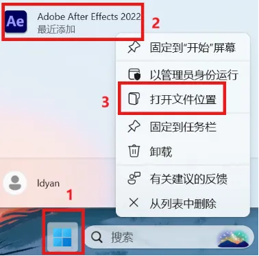 7.点击桌面下方开始菜单,选中Adobe After Effects 2022,点击鼠标右键,选择打开文件位置。
