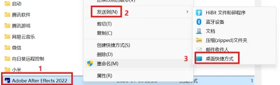 8.选中Adobe After Effects 2022,点击鼠标右键,选择发送到,点击桌面快捷方式。