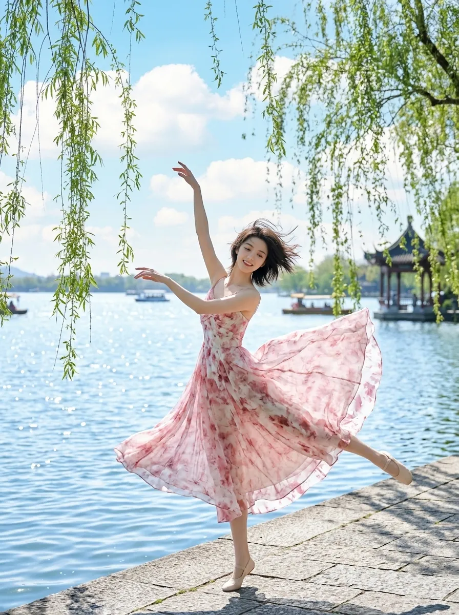 一个女孩在东湖边跳舞,湖水清澈,蓝天白云,垂柳依依,女孩穿着漂亮的裙子,姿态优美,阳光明媚,春日美景,温馨画面,高清摄影风格,自然光,电影感