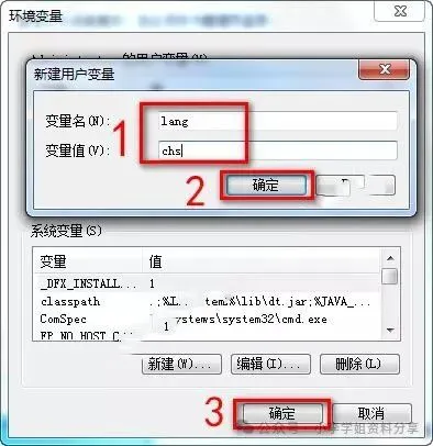 5.变量名输入:lang,变量值输入:chs,点击“确定”,再点击“确定” ![]() 6.点击“确定”