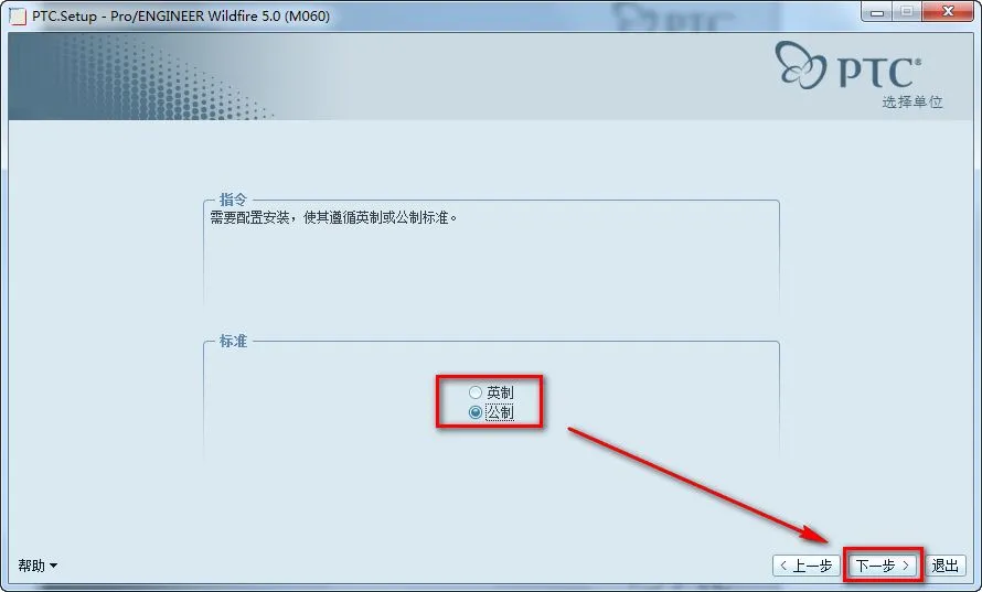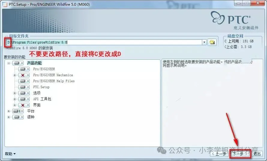 23.点击“Pro/ENGINEER” ![]() 24.直接将目标文件夹位置中的“C”改成“D”不要去更改其他路径,否则会导致破解失败,点击“下一步” ![]() 25.选择适合自己的标准,点击“下一步”