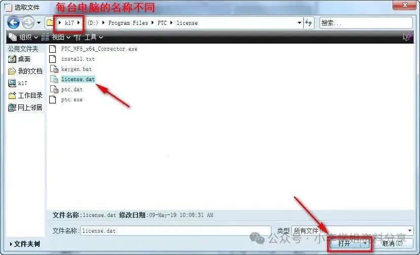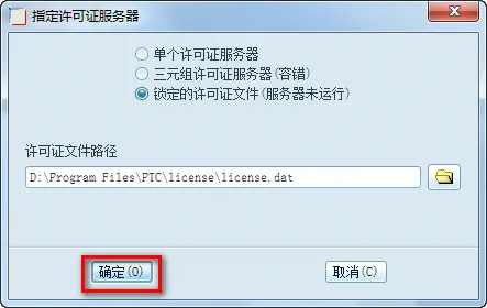 28.找到【license.dat】文件(第20步中生成的文件,路径为X:\Program Files\PTC\license\license.dat),点击“打开” ![]() 29.点击“确定”