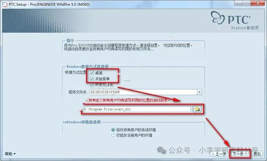 31.勾选快捷方式位置,更改启动目录,找到Program Files文件夹下的【start_dir】文件夹(路径为:X:\Program Files\start_dir),点击“下一步” ![]() 32.点击“下一步”
