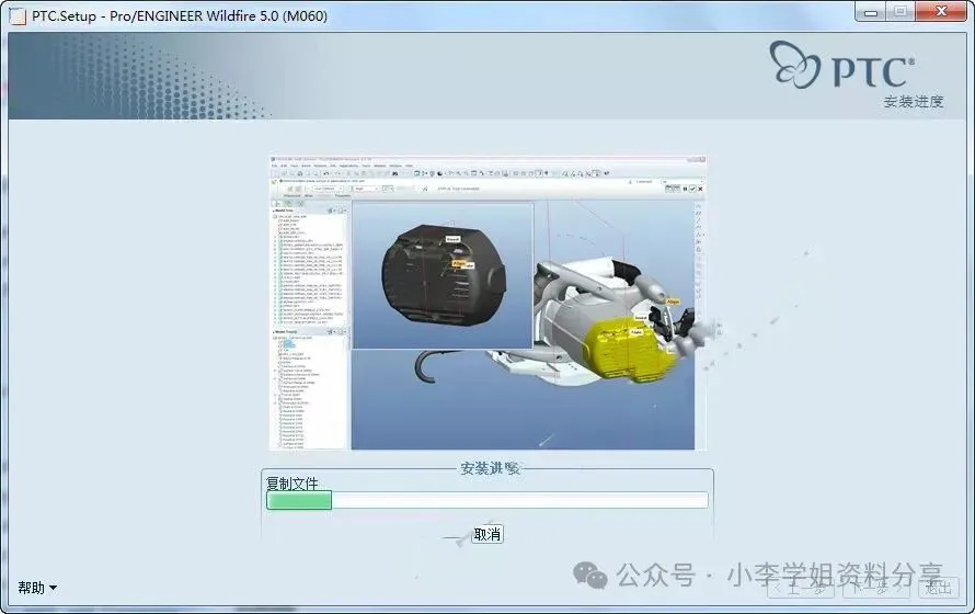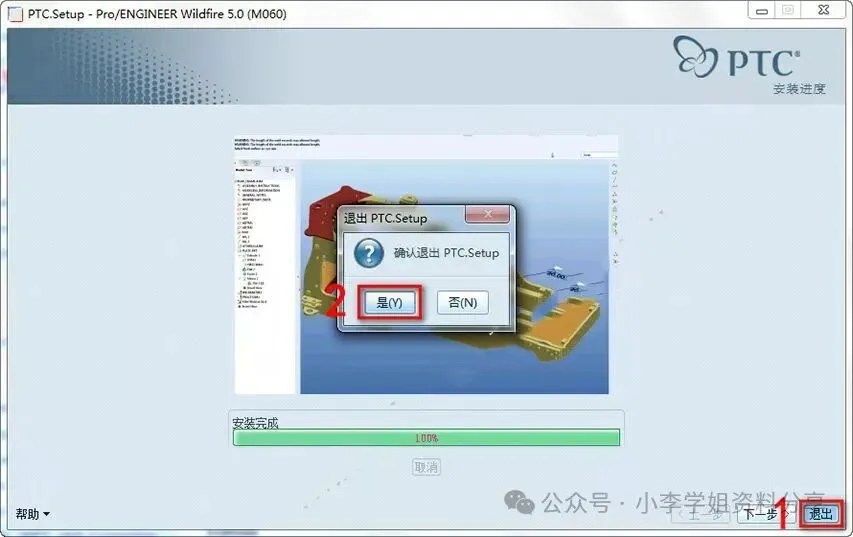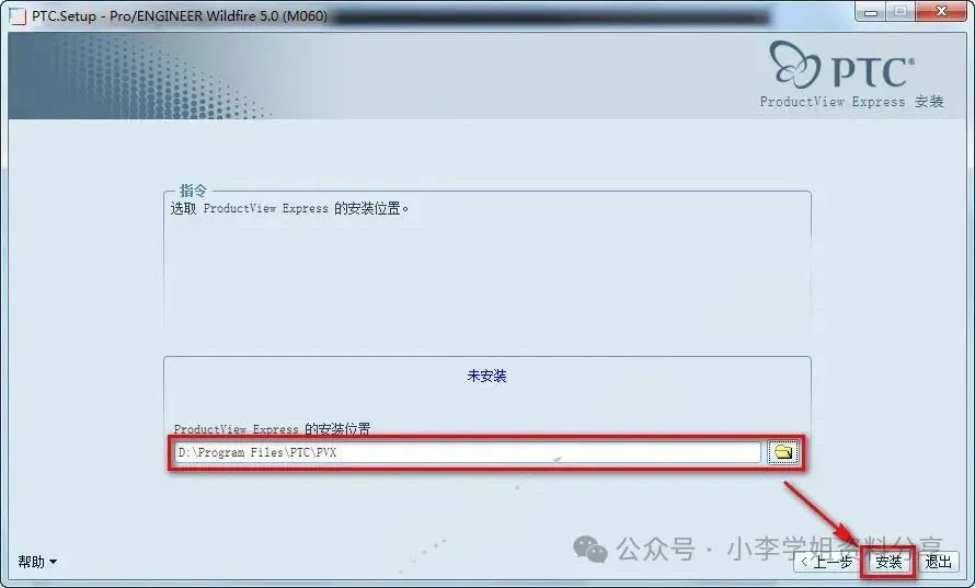 33.更改安装的位置,找到Program Files\PTC\PVX,点击“安装” ![]() 34.软件正在安装,请耐心等待 ![]() 35.安装完成,点击“退出”,点击“是” ![]() 36.打开Program Files\PTC\license文件夹,复制【PTC_WF5_Corrector】文件