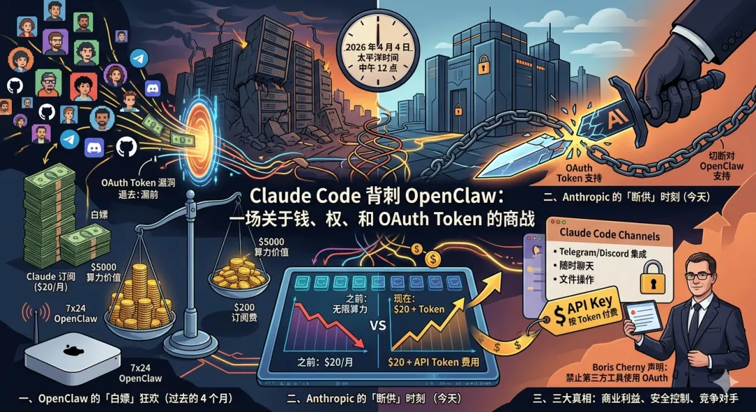 前言:就在刚刚——2026 年 4 月 4 日太平洋时间中午 12 点,Anthropic 正式切断了 Claude 订阅对 OpenClaw 的支持。Claude Code 负责人 Boris Cherny 的一则声明,让全球开发者在 24 小时内集体「血崩」。这不是计划中的产品调整,而是一场蓄谋四个月的「收网行动」。今天,咱们来聊聊这场刚刚发生的商战——比宫斗剧精彩,没那么多眼泪,主要是钱包在流泪。