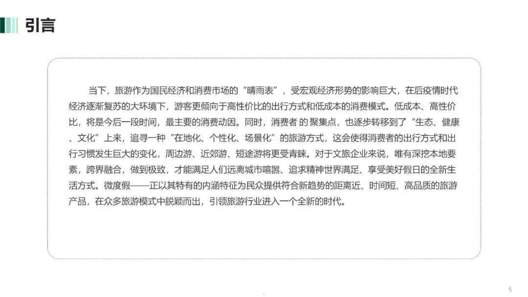 同时,消费者 的 聚集点,也逐步转移到了“生态、健康、文化”上来,追寻一种“在地化、个性化、场景化”的旅游方式,这会使得消费者的出行方式和出行习惯发生巨大的变化,周边游、近郊游、短途游将更受青睐。