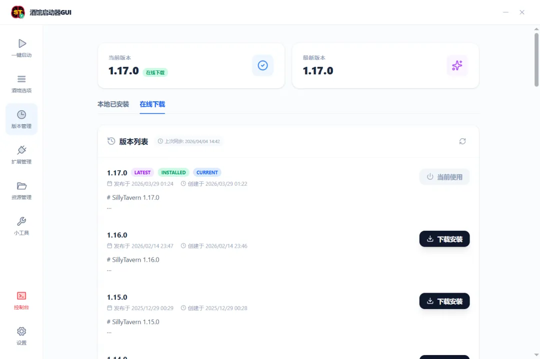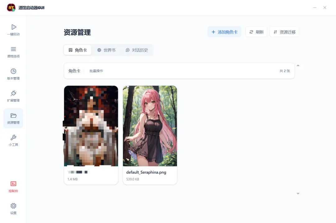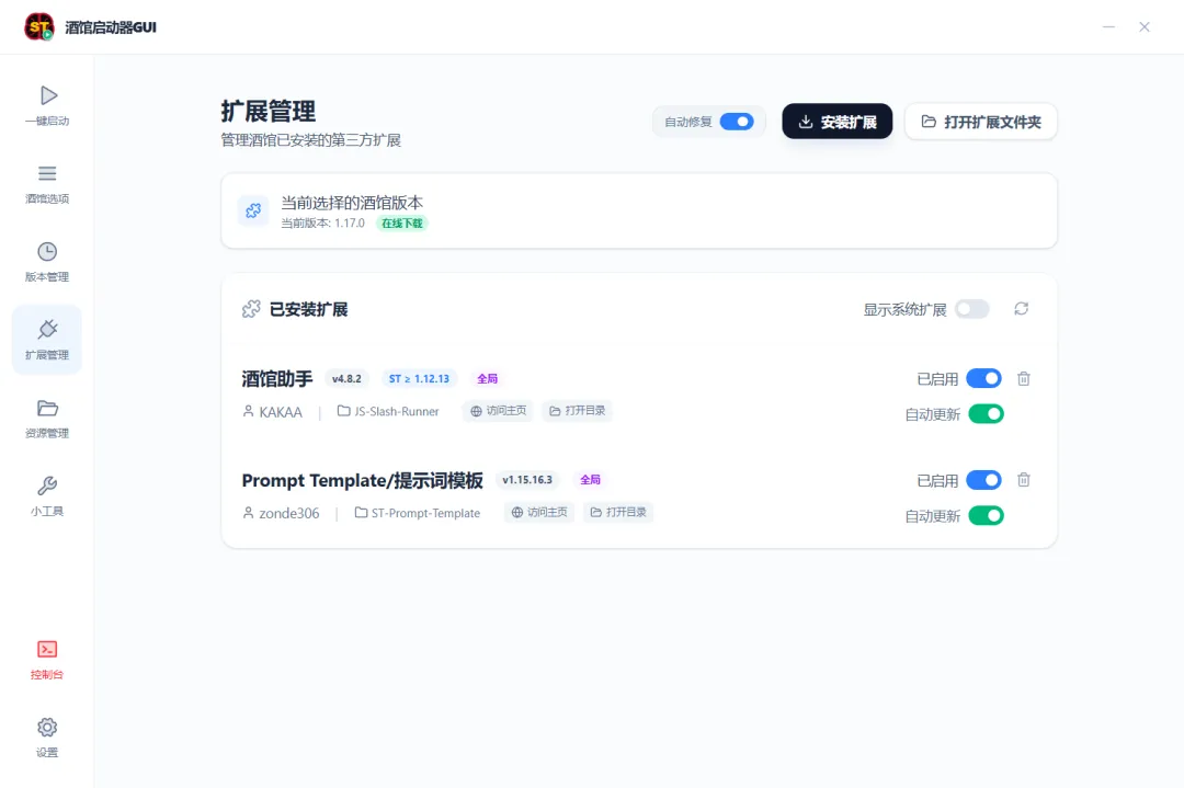 一键启停:一键启动/停止 SillyTavern 服务,实时查看控制台日志版本管理:可视化安装、切换、卸载任意 SillyTavern 版本扩展管理:浏览、启用/禁用、安装(支持 ZIP 离线包)、删除扩展酒馆配置:可视化编辑 config.yaml(端口、代理、白名单、备份、缩略图等)Node.js 管理:自动检测系统 Node.js / npm,支持一键下载内置私有 Node 环境角色卡管理:浏览、预览、导入、删除角色卡(PNG 格式)世界书管理:浏览、导入、删除世界书(JSON 格式)自动更新:基于 GitHub Releases 的静默自动更新(可关闭提醒)多语言:内置简体中文 / English,可跟随系统自动切换主题切换:深色 / 浅色主题,支持跟随系统GitHub 代理:内置多节点代理加速,解决 GitHub 下载慢的问题多种启动模式:可在 正常模式、局域网服务模式、公网服务模式、桌面模式 、DEBUG模式 中切换