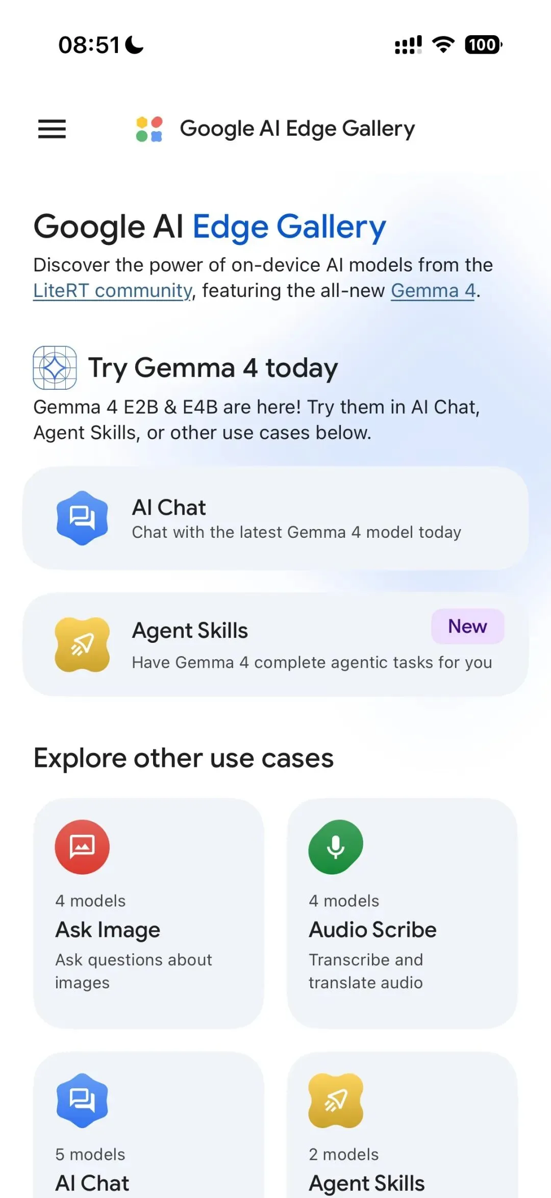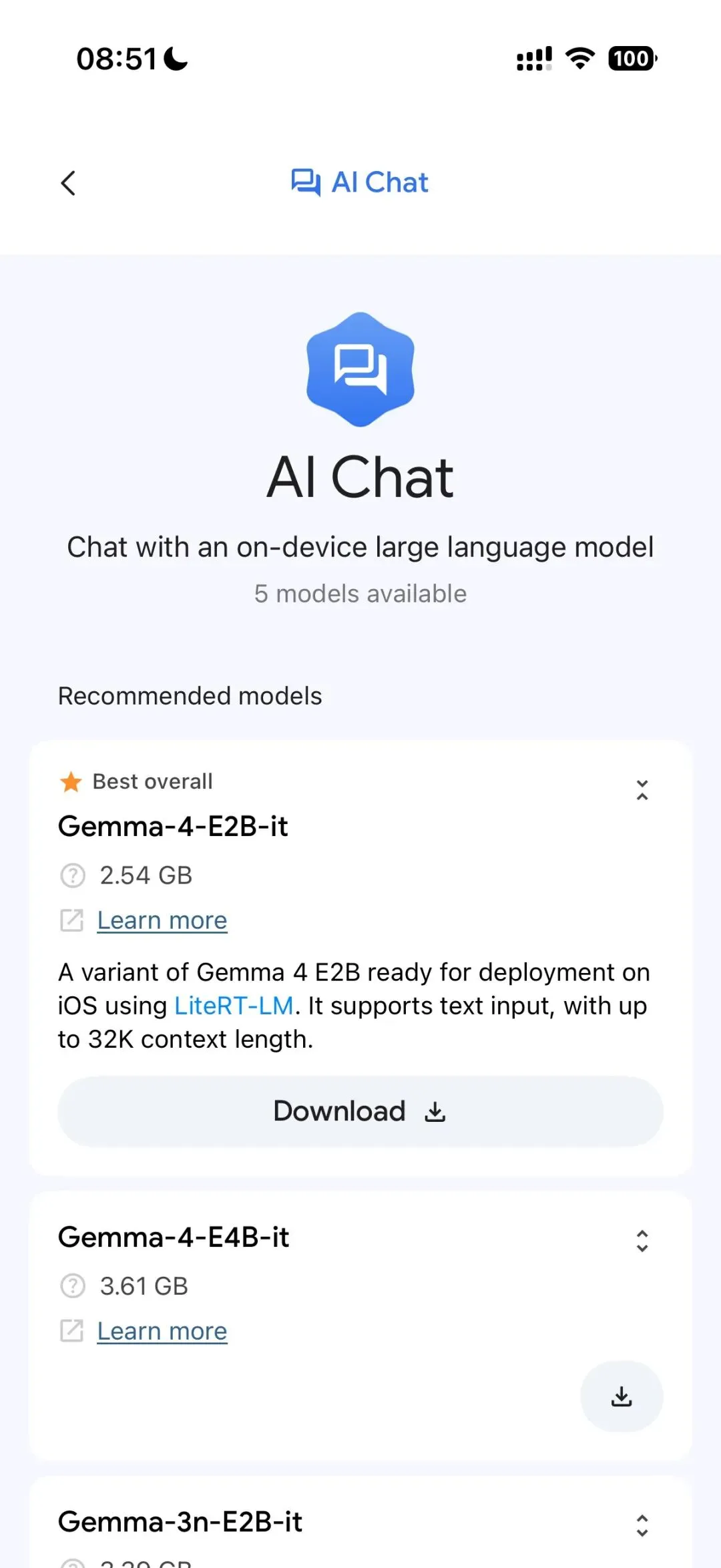 1. 打开你的应用商店,譬如iPhone的App Store; 2. 搜索Google AI Edge Gallery,安装; 3. 打开软件,点AI Chat,根据手机性能选择Gemma 4 E2B或者E4B下载模型; 4. 下载完成后,开始体验!