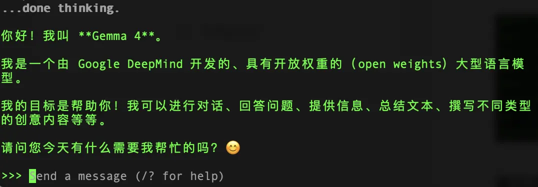 很多人关心是否支持中文,其实第一句话只要跟他说「你好」就可以了,实测Gemma 4模型均支持中文对话。