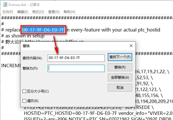 16.将PTC主机ID手动输入到替换内容栏,点击“全部替换”