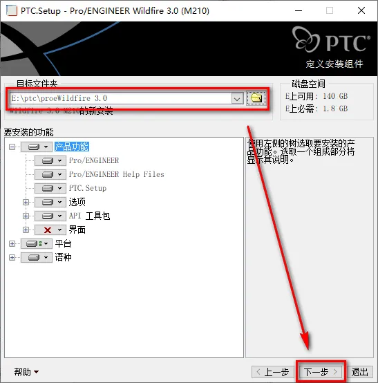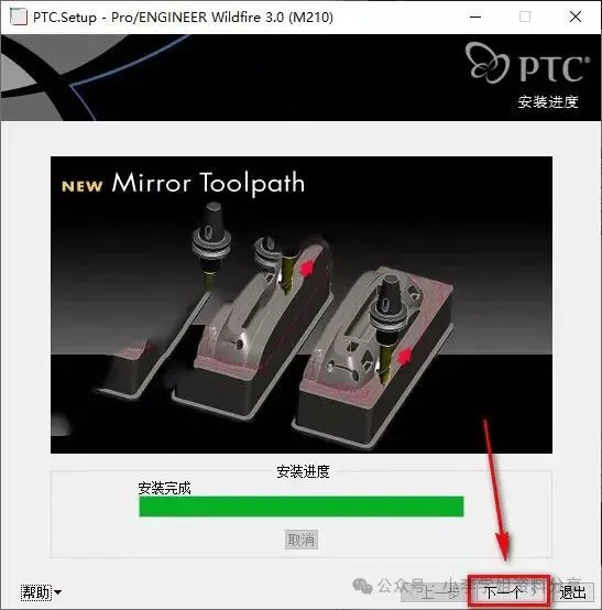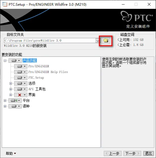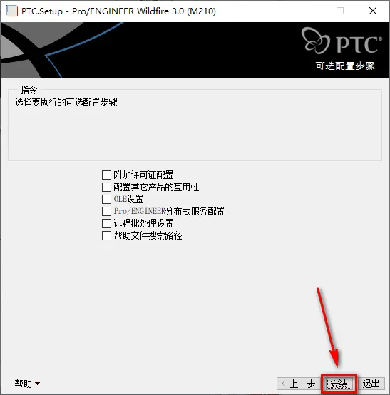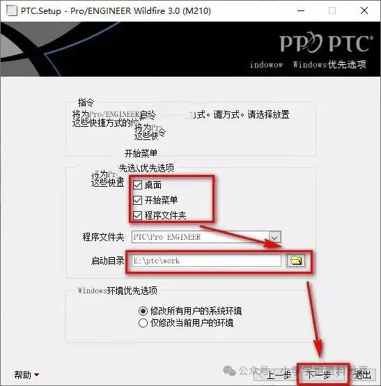 28.勾选快捷方式位置,更改启动目录,找到PTC文件夹下的【work】文件夹(路径为:X:\ptc\work),点击“下一步” ![]() 29.点击“安装”