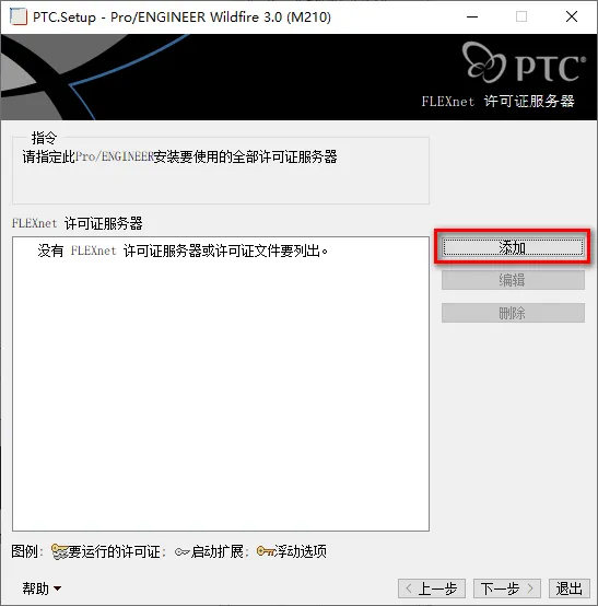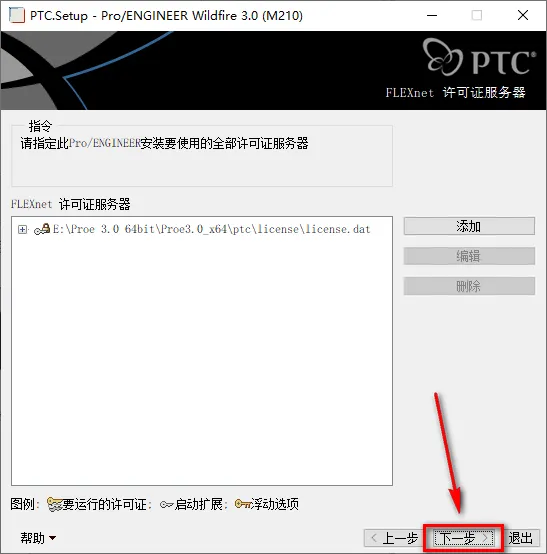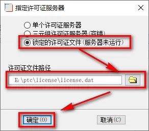 26.选择锁定的许可证文件(服务器未运行),更改路径,找到【license.dat】文件(第11步中修改的文件,路径为X:\ptc\license\license.dat)
