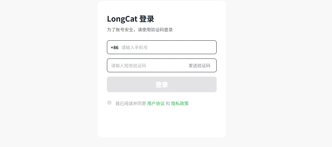 输入手机号(国内号码加 +86 前缀,例如 +86138xxxx1234) 点「发送验证码」,输入手机收到的短信验证码 勾选同意协议,点登录