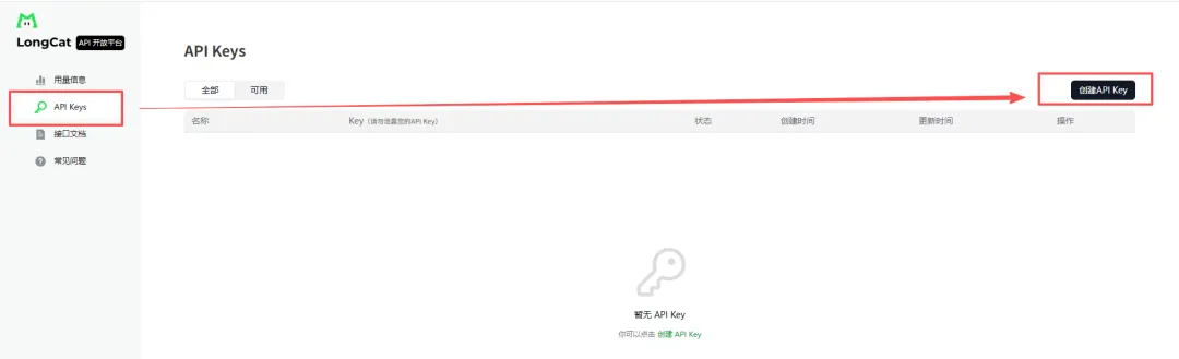 登录成功后,浏览器打开:https://longcat.chat/platform/api_keys 页面会显示你的 API Keys 列表。点 「创建 API Key」 或 「Create API Key」。