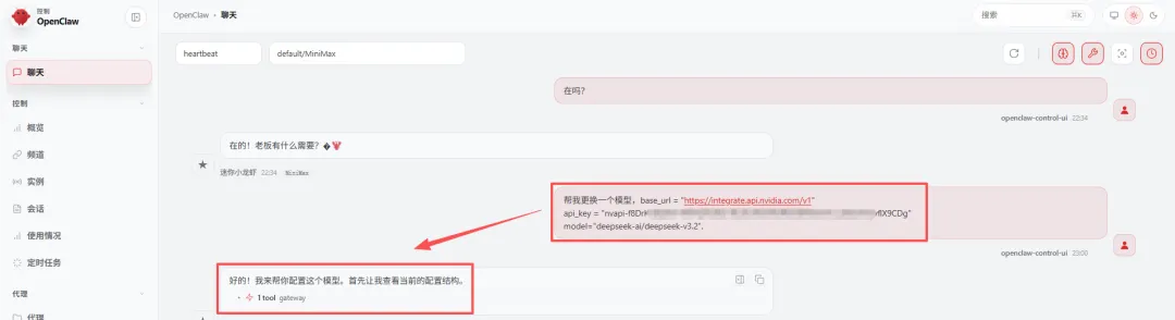 助手收到指令后会自动配置并重启Gateway。配置完成后,你可以向助手发送“你现在用的是哪个大模型?”进行确认。如果助手回复“已切换默认模型为新增模型”,说明接入大功告成,可以直接开始对话了。