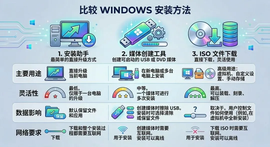 提供“安装助手”“制作安装媒体(U盘)”以及“直接下载ISO镜像”三种方式。三种方式区别如下: