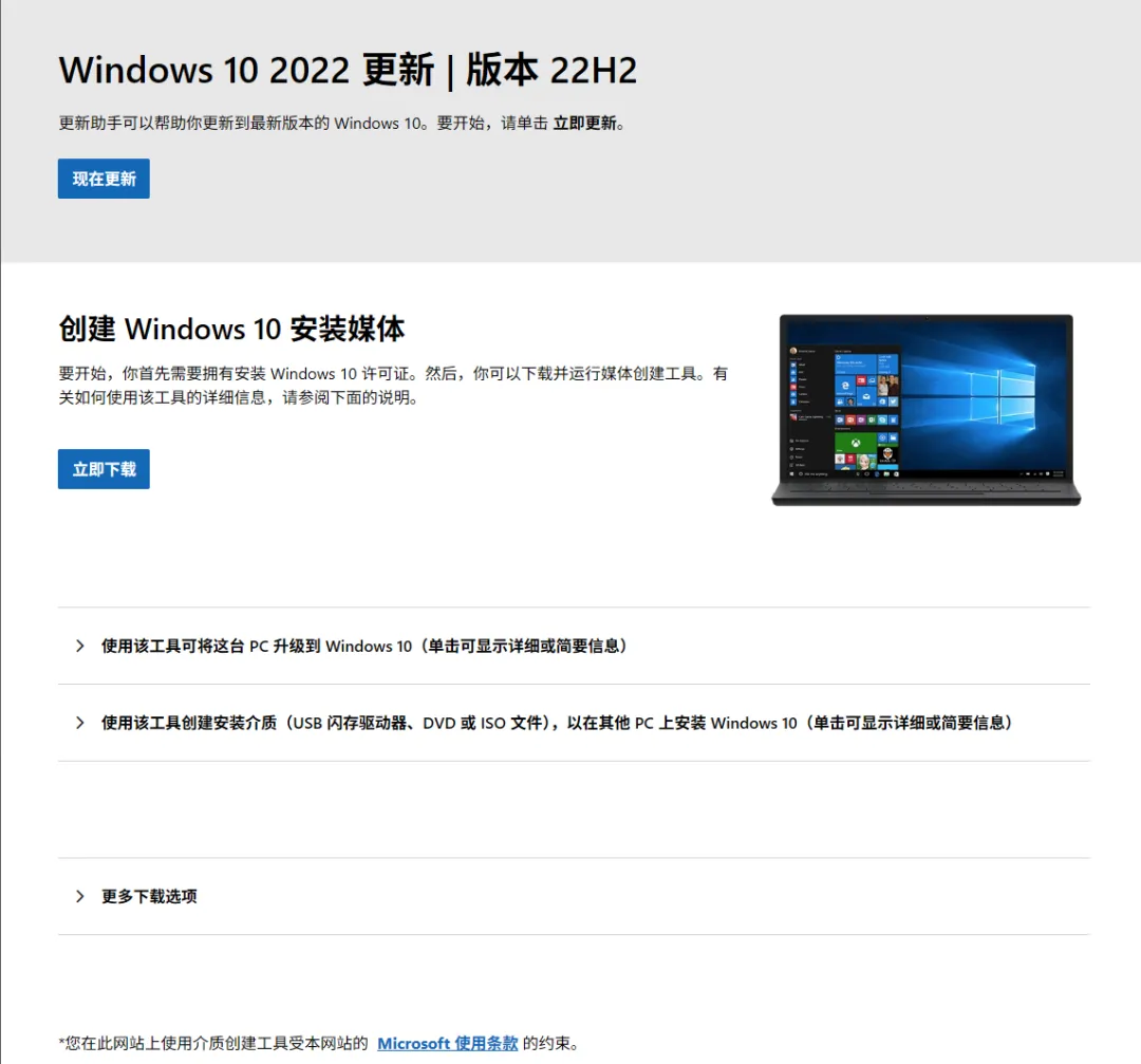 Windows10默认并没有直接开启ISO下载通道,默认只提供创建安装媒体(制作USB启动盘)。