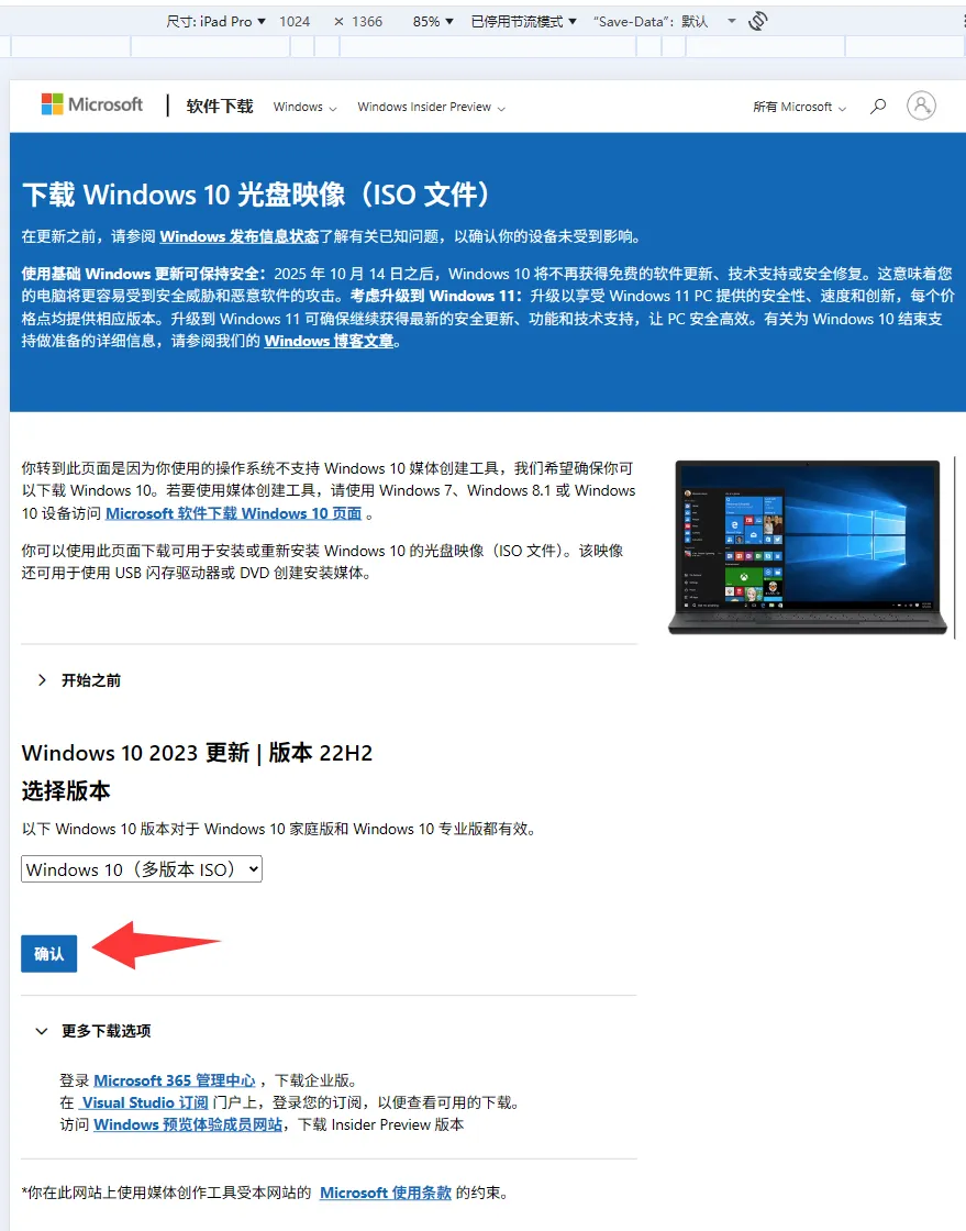 刷新后页面会出现“选择版本”下拉菜单。选择Windows10(multi-edition ISO),点击确认,选择语言后即可获取官方直链。