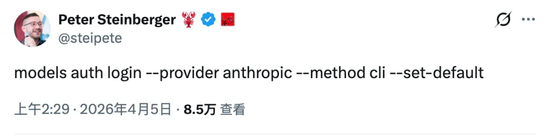 继前天 Anthropic 宣布(美东时间 4 月 4 日下午 3 点)Claude 订阅将不再覆盖 OpenClaw 等第三方工具的使用。在生效前半个小时,也就是 2 点 29 分,OpenClaw 创始人在推特发布新的迁移协议。