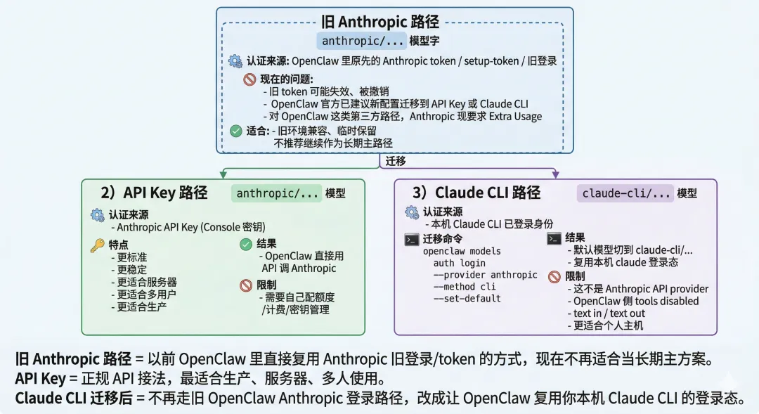 openclaw tui本质上不是给你一个新的 API Key,而是把 OpenClaw 的默认 Anthropic 模型路径,从 anthropic/... 切到本机 claude-cli/...,让 OpenClaw 复用你这台电脑上已经登录好的 Claude Code CLI 身份。OpenClaw 官方也明确把这条命令定义成 “migrate to Claude CLI”。