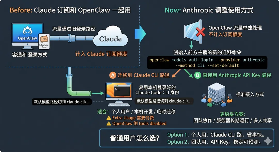 个人用户还能通过 Claude CLI 迁移继续用,VPS用户可以直接换大模型了。但这条路也不再等同于原来的订阅免费额度;团队和生产环境,优先考虑 Anthropic API Key。