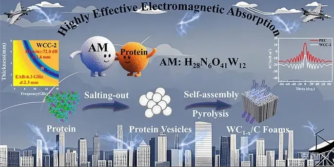 中文题目:基于蛋白盐析效应构筑三维定向多孔WC₁₋᙮/C泡沫用于高效电磁波吸收
