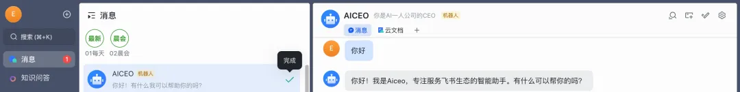 该模式适用于单人、小型团队初步使用,实现单个AI机器人对接单个飞书账号,完成基础交互和自动化任务。