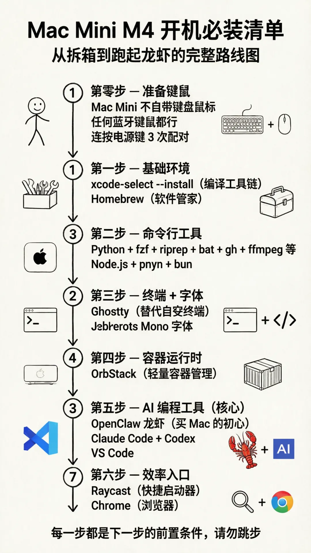 这篇文章是我拿到一台新的 Mac mini 的完整装机记录。从开机到安装工具,然后再安装龙虾,我会一步一步告诉你这台电脑应该装什么,以及为什么要装。