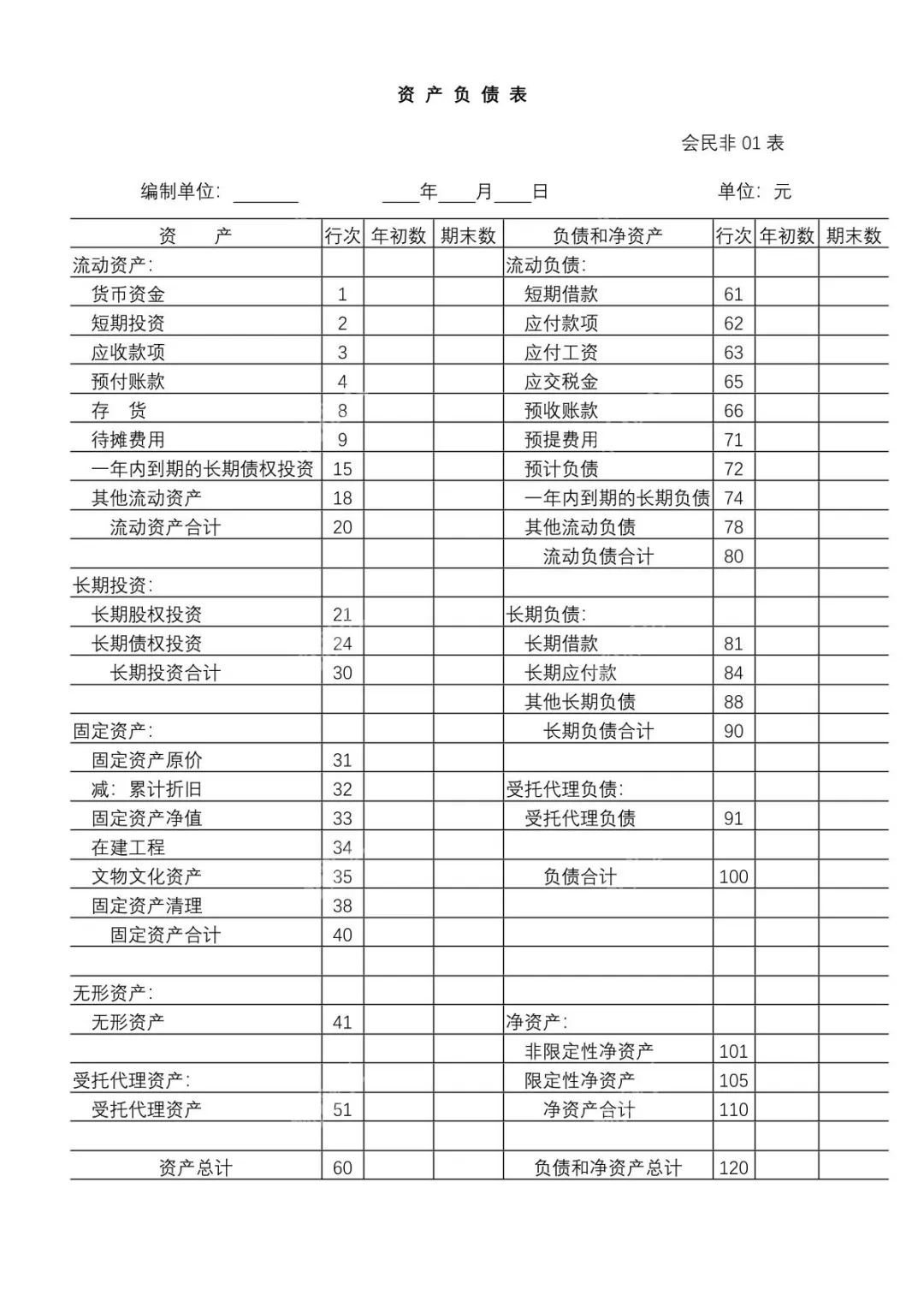 包含资产负债表、业务活动表、现金流量表的民间非营利组织标准会计报表模板,含会民非01、02、03表格式,适用于民非机构财务填报。