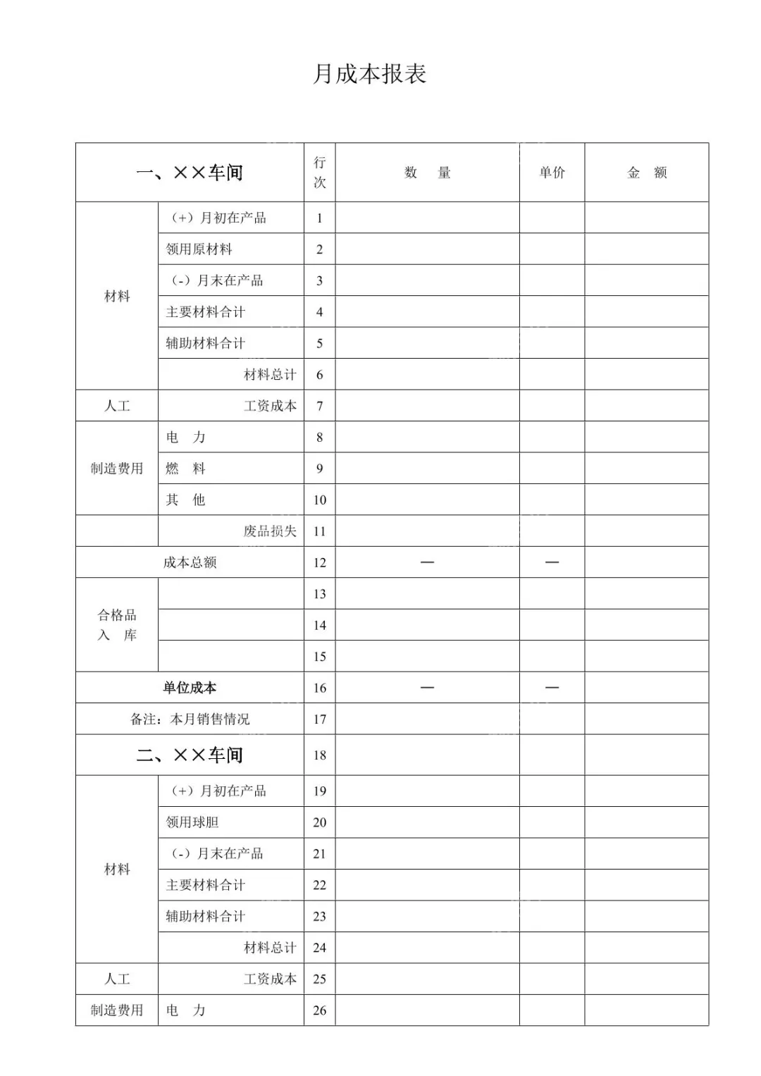 包含多车间的月成本报表模板,涵盖材料、人工、制造费用等成本项目,清晰统计车间成本构成,便于成本核算与管控。