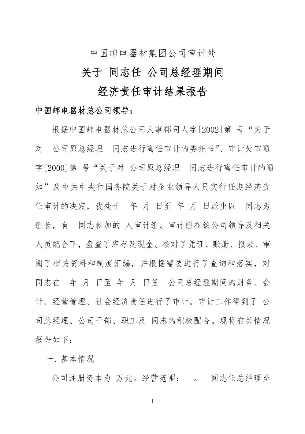 本报告为中国邮电器材集团审计处出具,针对某同志任公司总经理期间的资产、负债、损益、内控等情况开展离任经济责任审计,呈现审计结果、问题及评价建议。